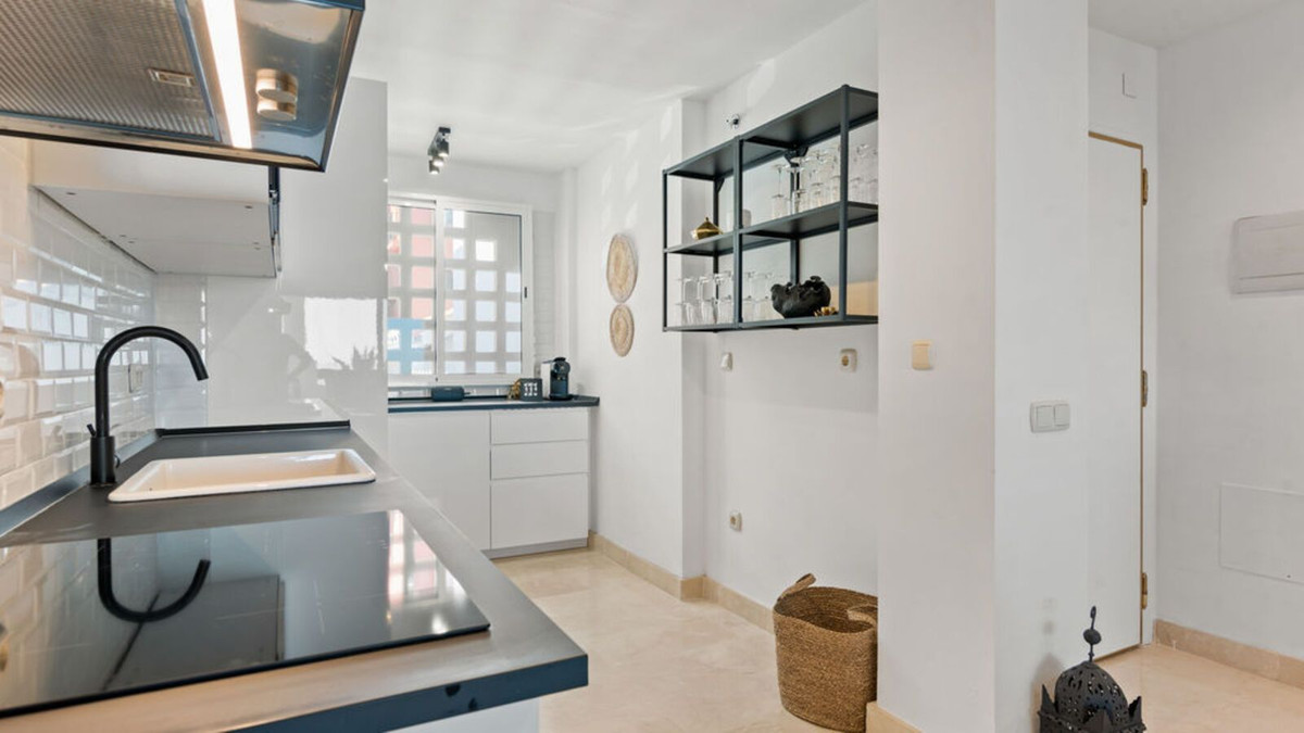 The bright and airy living room opens onto a lovely terrace where you can enjoy sunny days, relaxing dinners, and breathtaking views of the Mediterranean. The kitchen has been fully renovated with clean lines and light materials, creating a calm and elegant atmosphere.