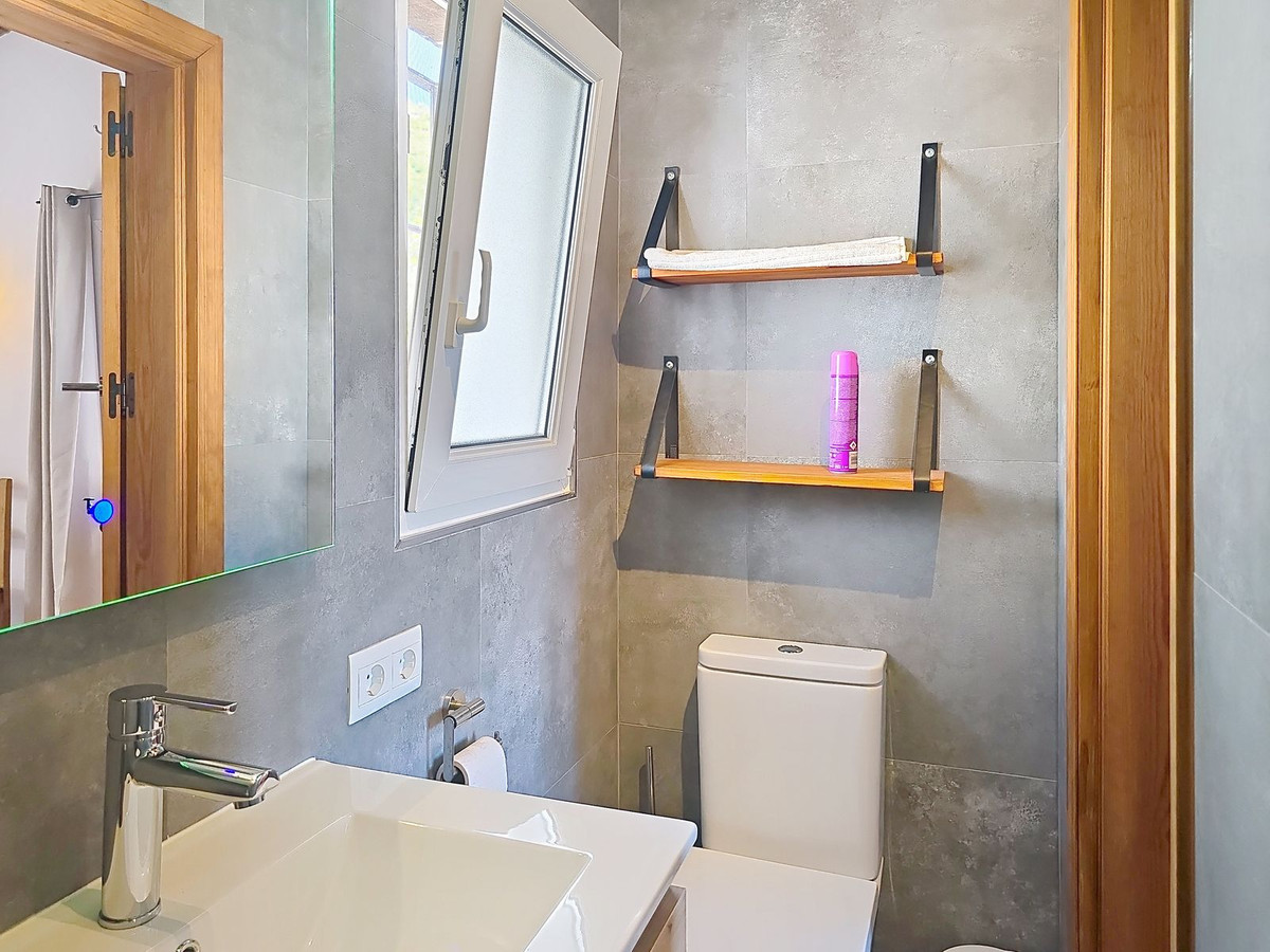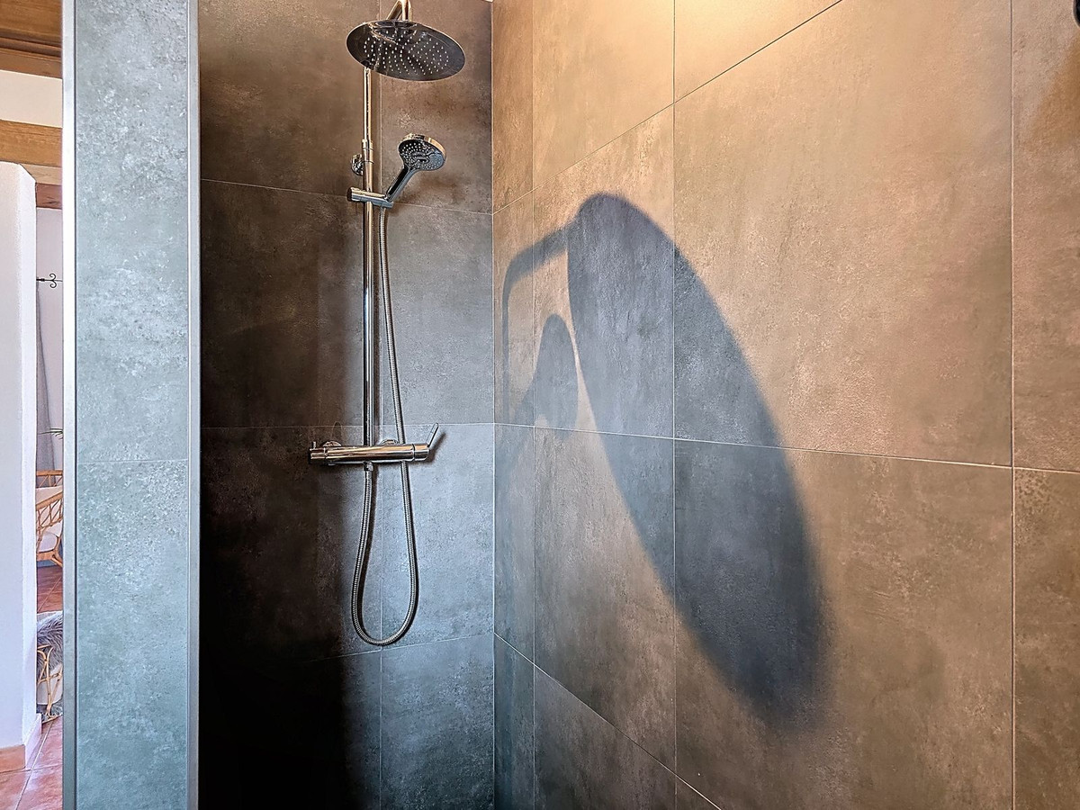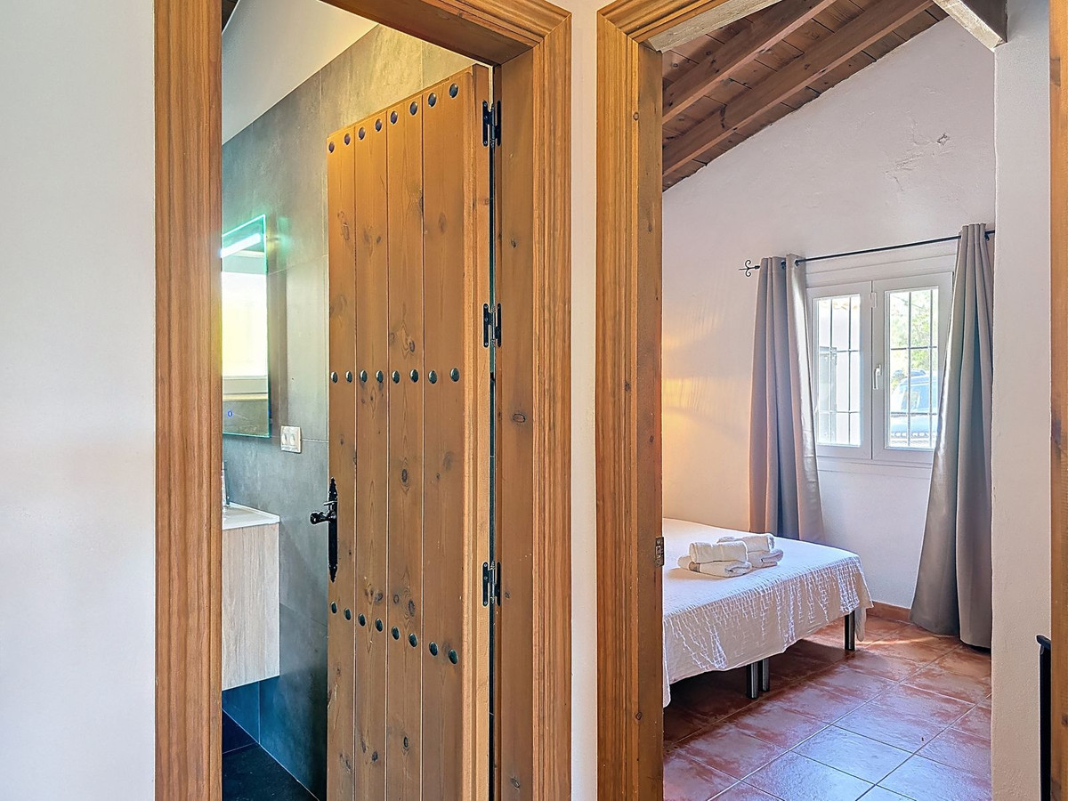 The property offers three well-proportioned double bedrooms, each with built-in storage and views of the surrounding countryside. One of the bedrooms benefits from an en-suite bathroom, providing added privacy and convenience. A second, family-sized bathroom is finished with traditional Andalusian tiles and stylish fixtures, offering a bright and functional space for residents and guests alike.