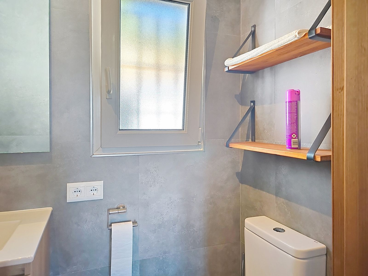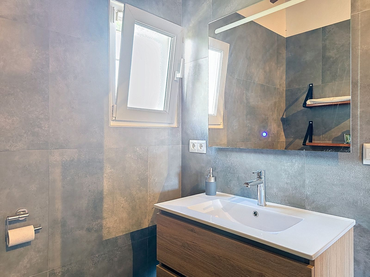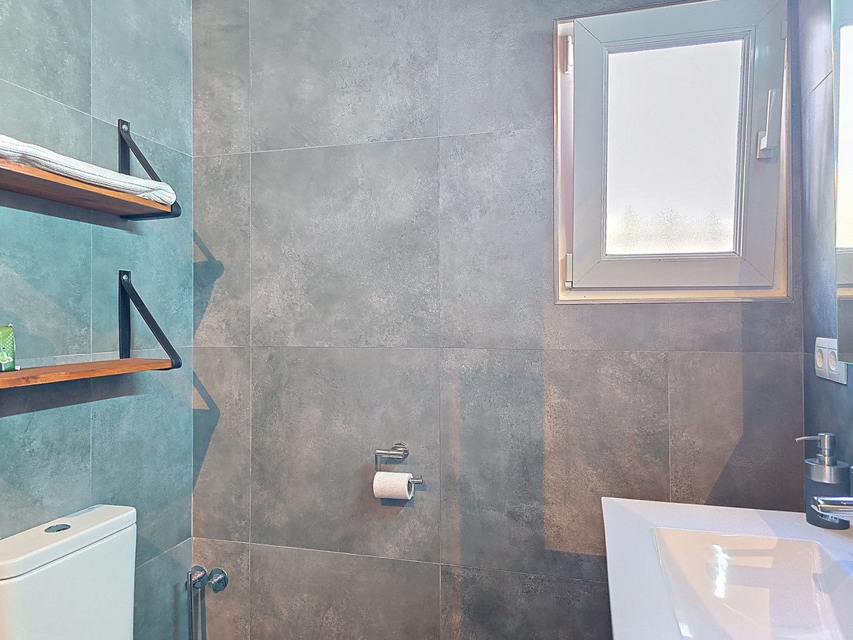 The property offers three well-proportioned double bedrooms, each with built-in storage and views of the surrounding countryside. One of the bedrooms benefits from an en-suite bathroom, providing added privacy and convenience. A second, family-sized bathroom is finished with traditional Andalusian tiles and stylish fixtures, offering a bright and functional space for residents and guests alike.