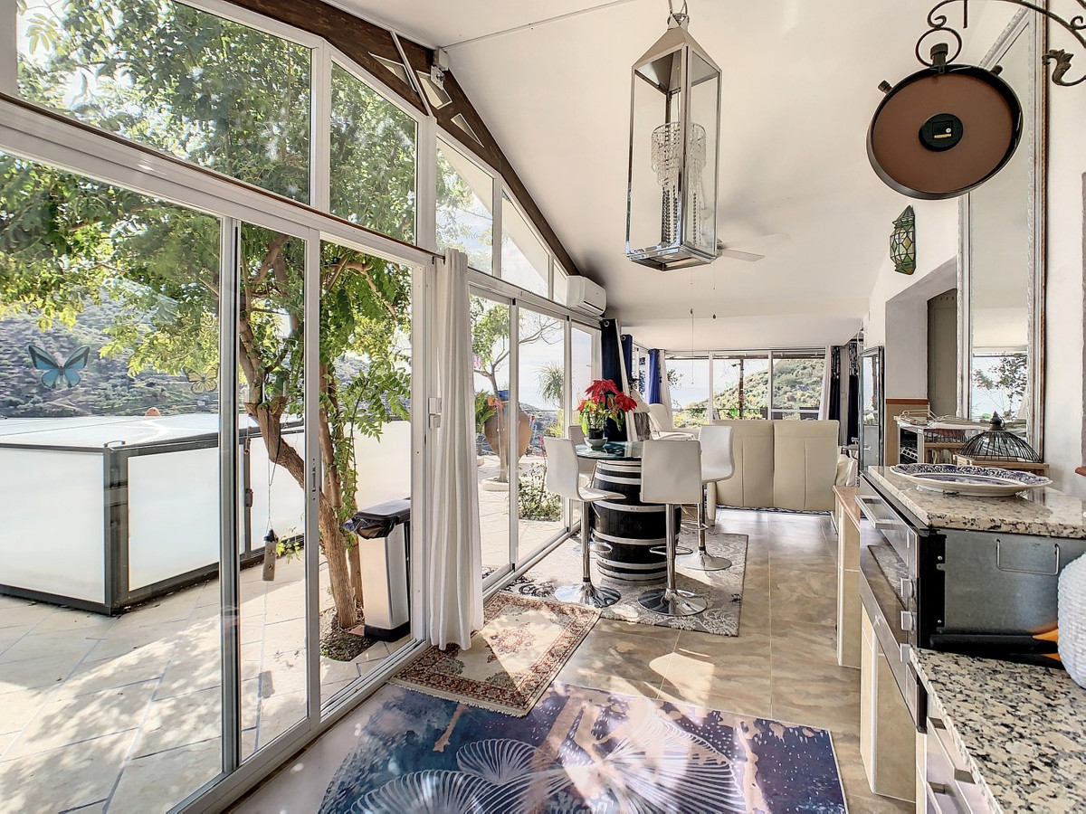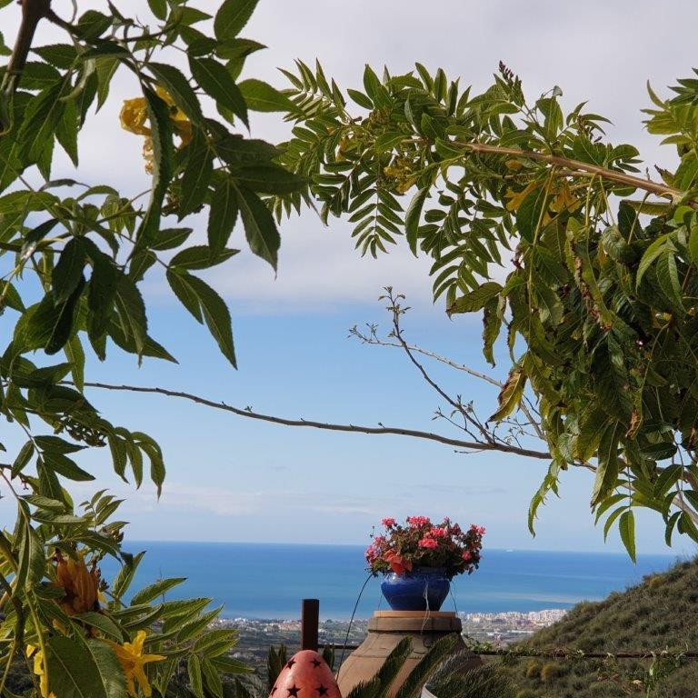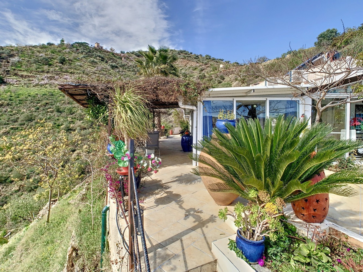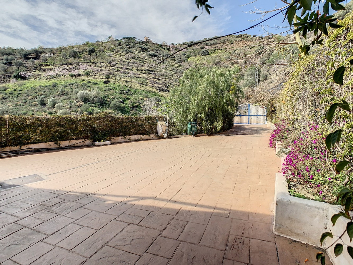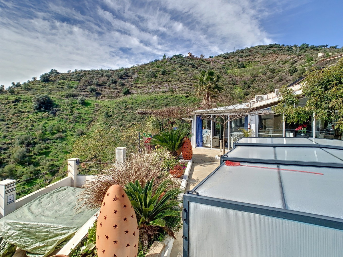 You are looking for a large villa with a heated swimming pool, neatly hidden nearly at the top of a mountain, surrounded by nature with breath-taking views of the valley up to the sea and the village of Arenas? This might just be what you are looking for. At the entry of the property, you find a covered parking space for at least 6 cars and a workshop. From there you step onto a wide porch that surrounds the whole property. In the centre of the house, that ́s all on one level, you find an office, 3 bedrooms, 2 bathrooms (one on-suite), 2 kitchens, an open bbq space, a large sitting/dining room and more sitting areas with views to the outside through French doors. Around the porch there is an array of different privative sitting/sunbathing spaces where it is just a dream to be. Here you also find the heated swimming pool, palm trees, an exterior bedroom and a passage leading to little romantic benches with fantastic views all around the foot of the property. There is also an outdoor kitchen. This property is well finished and comes with all the amenities. It is perfect for people that are fond of comfort and privacy. We are pleased to be able to present this dream property to you soon, either personally or via virtual viewing. Because this world, it is unique - just like our Axarquía. In Andalusia. On the Costa del Sol. Here, on the sunny side of life...