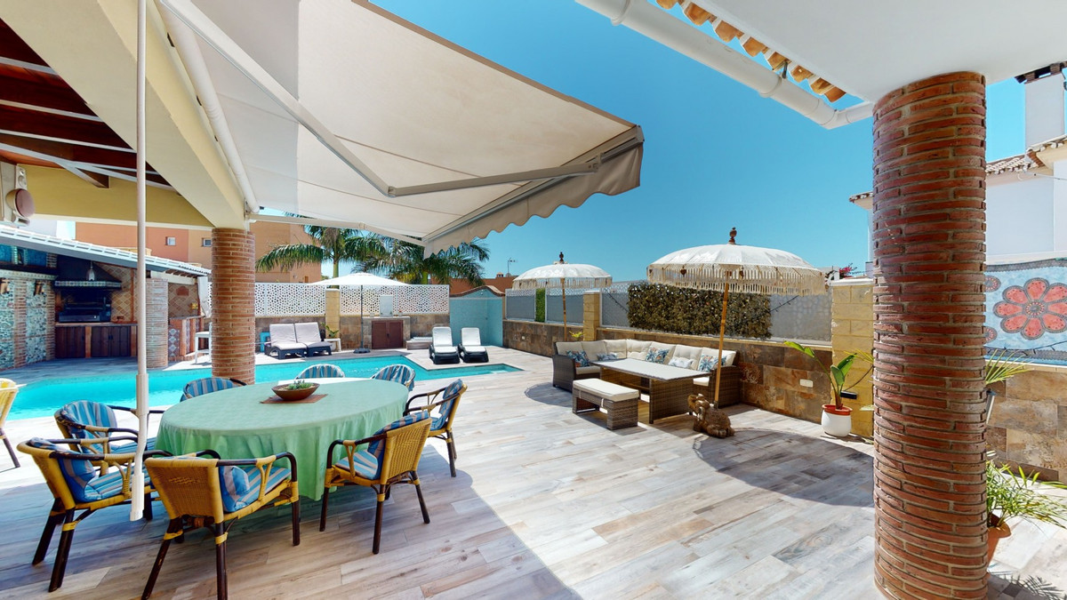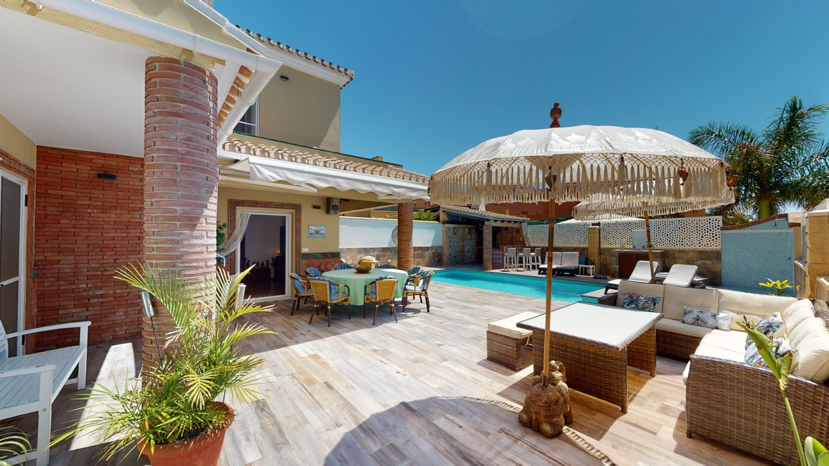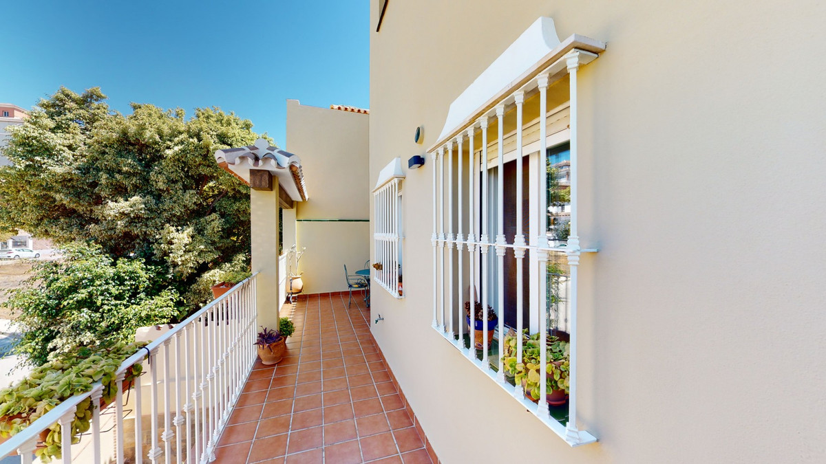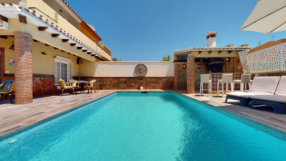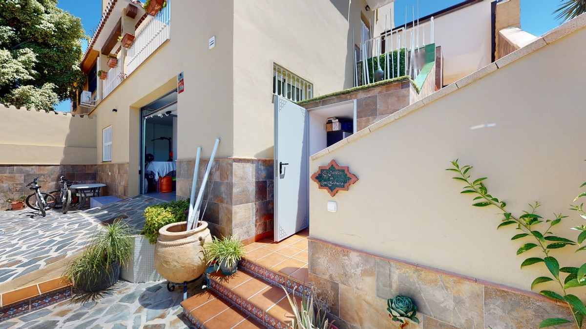Beautiful, renovated semi-detached house in the quiet residential area of Viña Malaga. The three-storey house has two entrances. It is divided into 3 bedrooms, 3 bathrooms, a guest toilet, 2 kitchens, a living room and a home cinema. The outdoor area offers various chill-out areas, a pool, and an outdoor kitchen with barbecue. In the basement there is a double garage, which is now used as a cinema, as well as a gym, a kitchen and a guest toilet. This part can be used for entertaining friends, or as an independent apartment with 2 bedrooms. There is direct access from the garage to the ground floor. The ground floor has an entrance hall with a wardrobe, a bathroom with a shower, a kitchen with all modern appliances and an exit to the balcony, and a living and dining room with a fireplace. From the living room there is also an exit to the beautiful outdoor area. There you will find the large patio with many seating and lounging areas around the 4 x 8 m pool, an outdoor shower and stylish decorations. There is also a rustic bar and a barbecue area with water and electricity. In the evening, everything is romantically lit and you can enjoy wonderful meals with family and friends. On the first floor are the three bedrooms, one of which has a dressing room and on-suite bathroom. Each bedroom has its own balcony with sea views. The house was built in 2002 and was recently renovated. Don't miss the opportunity to visit this beautiful semi-detached house, which is only 5 minutes away from the beach, the motorway and the golf course. We are pleased to be able to present this dream property to you soon, either personally or via virtual viewing. Because this world is unique - just like our Axarquía. In Andalusia. On the Costa del Sol. Here, on the sunny side of life...