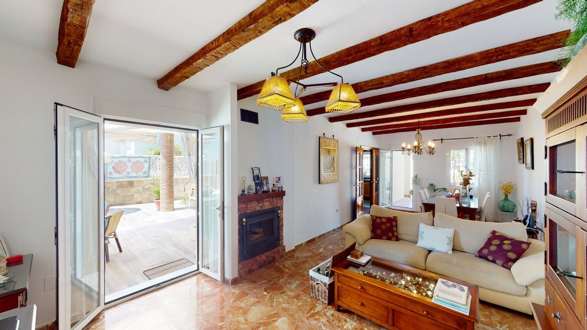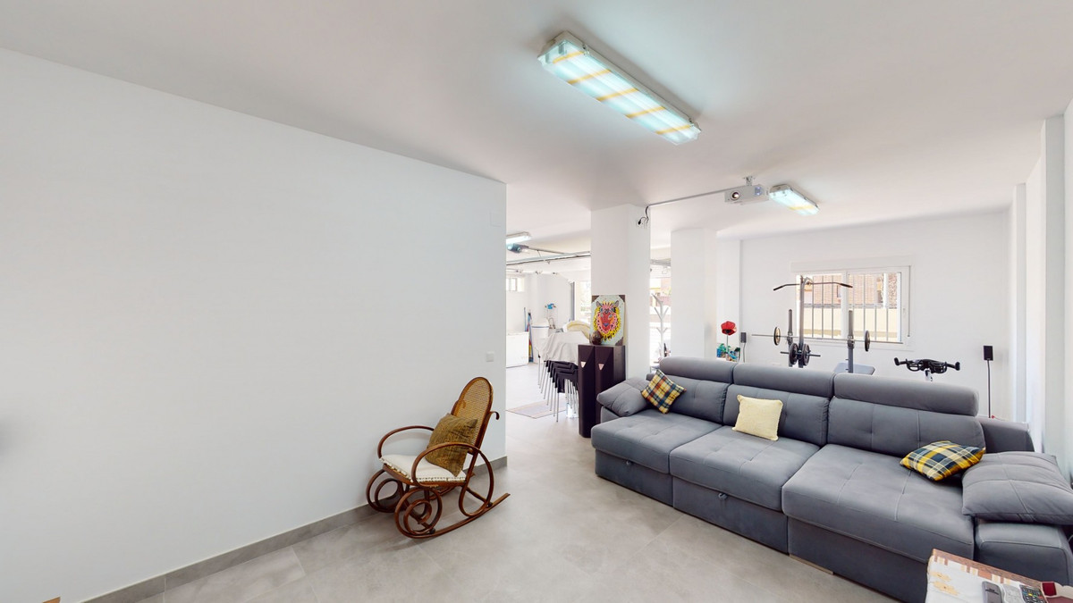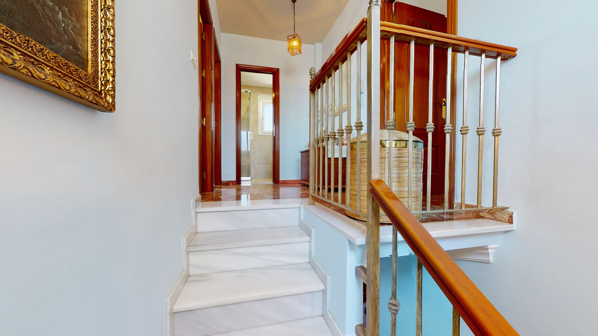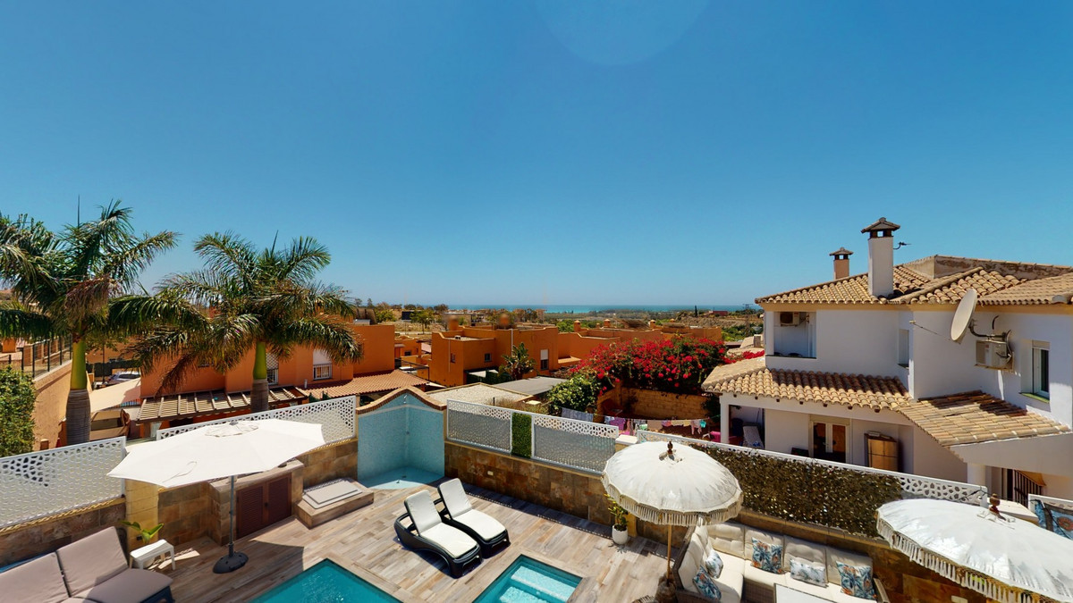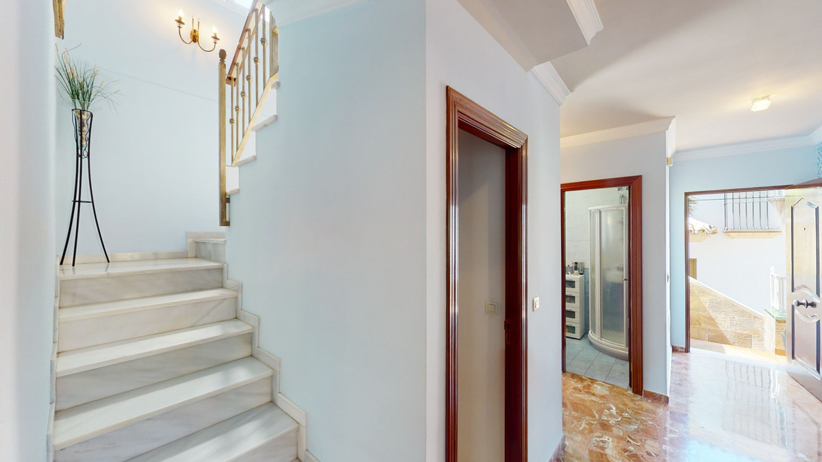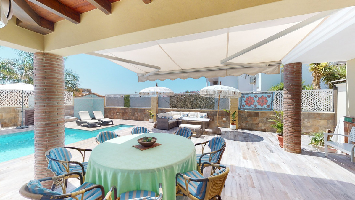 Beautiful, renovated semi-detached house in the quiet residential area of Viña Malaga. The three-storey house has two entrances. It is divided into 3 bedrooms, 3 bathrooms, a guest toilet, 2 kitchens, a living room and a home cinema. The outdoor area offers various chill-out areas, a pool, and an outdoor kitchen with barbecue. In the basement there is a double garage, which is now used as a cinema, as well as a gym, a kitchen and a guest toilet. This part can be used for entertaining friends, or as an independent apartment with 2 bedrooms. There is direct access from the garage to the ground floor. The ground floor has an entrance hall with a wardrobe, a bathroom with a shower, a kitchen with all modern appliances and an exit to the balcony, and a living and dining room with a fireplace. From the living room there is also an exit to the beautiful outdoor area. There you will find the large patio with many seating and lounging areas around the 4 x 8 m pool, an outdoor shower and stylish decorations. There is also a rustic bar and a barbecue area with water and electricity. In the evening, everything is romantically lit and you can enjoy wonderful meals with family and friends. On the first floor are the three bedrooms, one of which has a dressing room and on-suite bathroom. Each bedroom has its own balcony with sea views. The house was built in 2002 and was recently renovated. Don't miss the opportunity to visit this beautiful semi-detached house, which is only 5 minutes away from the beach, the motorway and the golf course. We are pleased to be able to present this dream property to you soon, either personally or via virtual viewing. Because this world is unique - just like our Axarquía. In Andalusia. On the Costa del Sol. Here, on the sunny side of life...