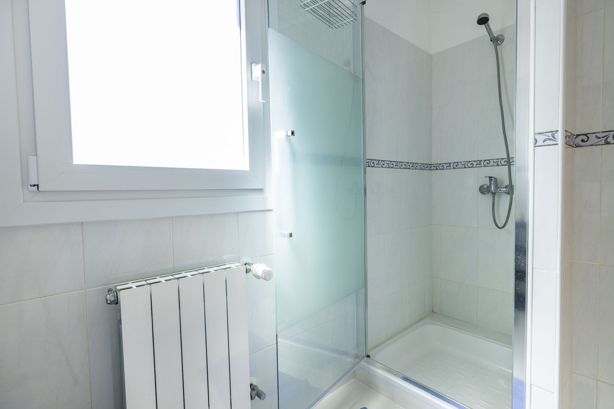 - On the ground floor, you’ll find a comfortable bedroom with en suite bathroom (shower, toilet, sink) and air conditioning.