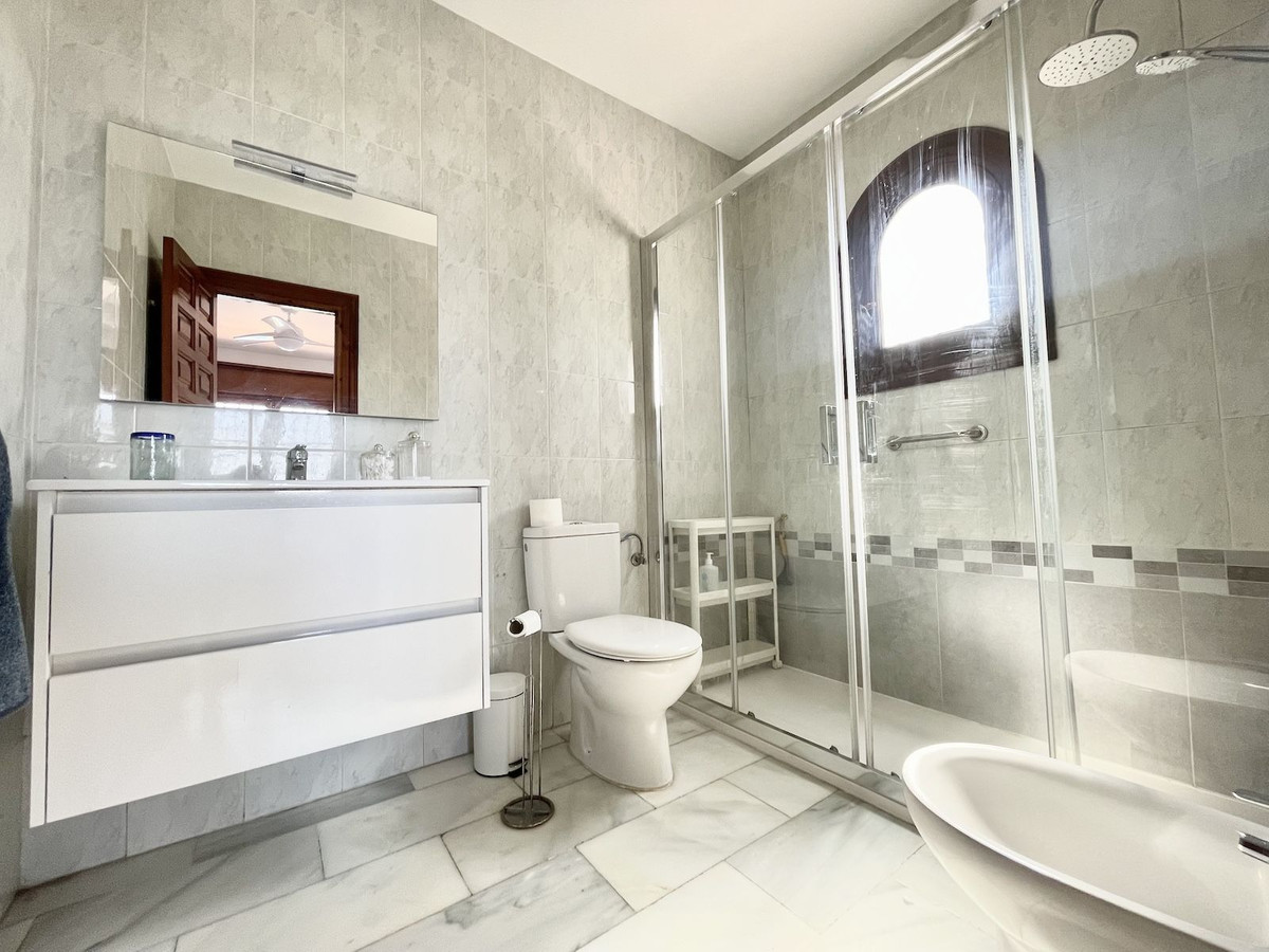 Inside, the home has classic Spanish charm, featuring a spacious lounge with a cosy fireplace, perfect for cooler evenings, and air conditioning for year-round comfort. The layout includes two generously sized bedrooms with fitted wardrobes and two bathrooms, including a master en-suite.