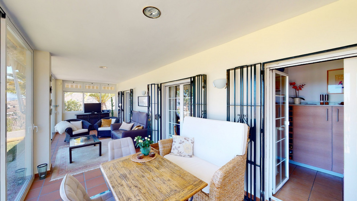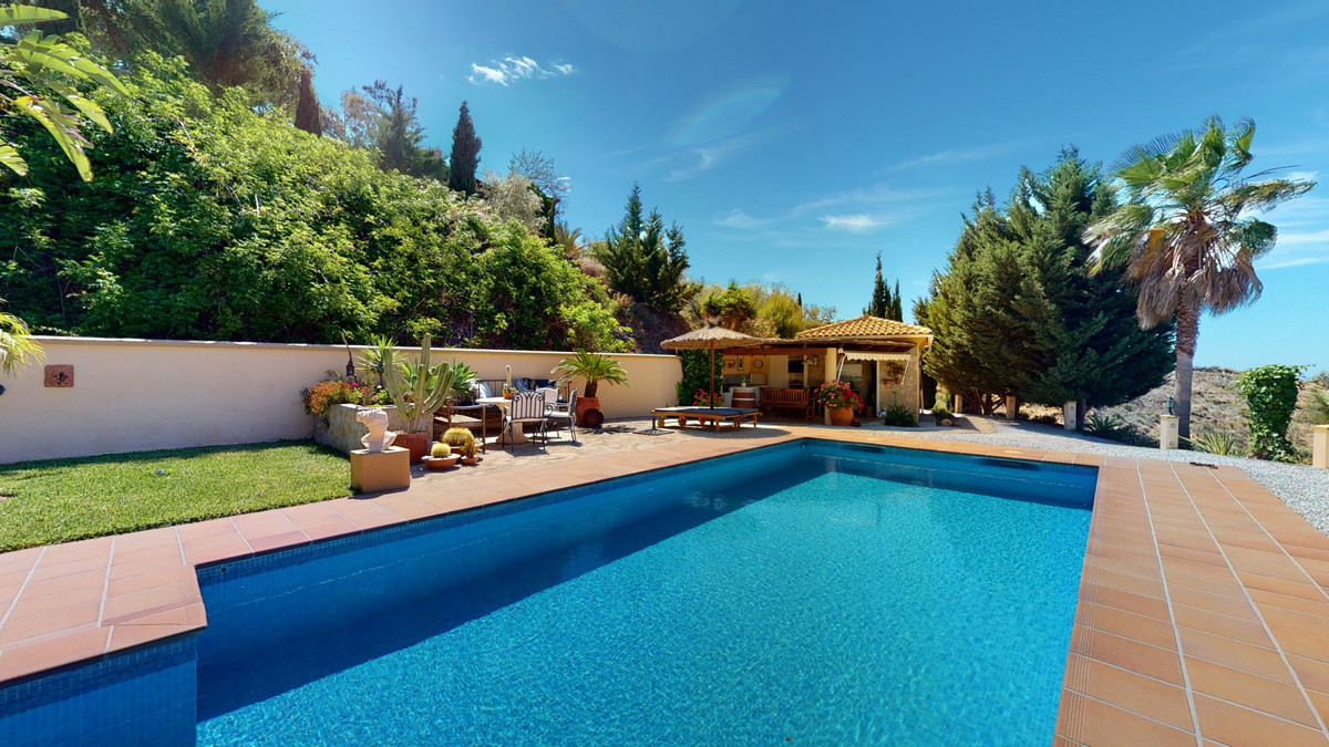 The perfect view paired with the right southwest orientation, which together gives the superlative to absolute happiness. A villa which leaves nothing to be desired, built to a very high standard with an incomparable beautiful garden with spa, sauna and pool, a luxurious outdoor kitchen with integrated dining area. All this and more is offered by this unique villa, located between Algarrobo and Sayalonga. Due to its exposed location, in addition to absolute privacy, you have the romantic view of the setting sun - partly over the Mediterranean Sea and sometimes - depending on the season - over the fabulous mountain landscape of Málaga. Over an asphalted, with pines lined private access road one reaches the imposing entrance area of the property , where a palm island is in the midst of rondel. There are several parking spaces and a garage plus a large carport. On the first floor of the villa is the living room with separate fireplace room, a guest toilet and laundry room, a modern kitchen with access to the very spacious conservatory, which lacks nothing. Further, on the first floor there is a really nice bedroom with a bathroom on suite. On the upper floor of the villa is the master bedroom with a spacious bathroom on-suite , as well as an attached dressing room. The property is equipped with central heating, air conditioning and a fireplace. On the plot are planted a variety of fruit trees, palm trees , tropical plants and pine trees. 15 minutes to the beach and the sea, as well as the golf course and marina of Caleta - and only 40 minutes drive to the airport of Málaga. We are pleased to be able to present this dream property to you soon, either personally or via virtual viewing. Because this world, it is unique - just like our Axarquía. In Andalusia. On the Costa del Sol. Here, on the sunny side of life...