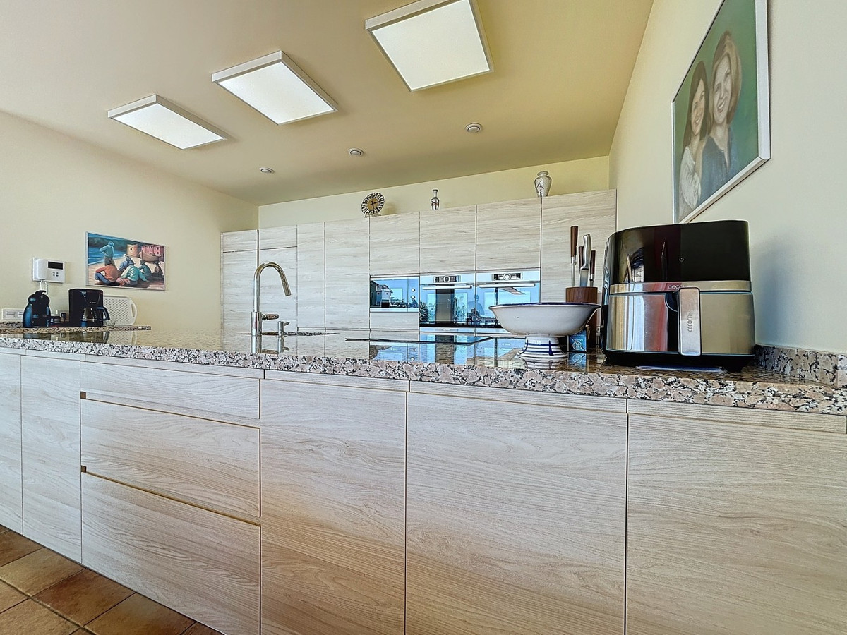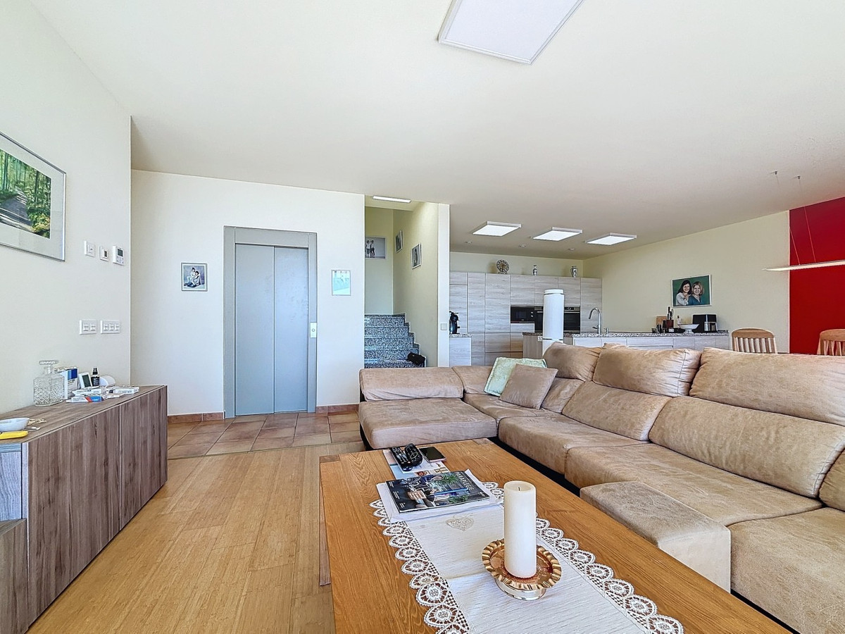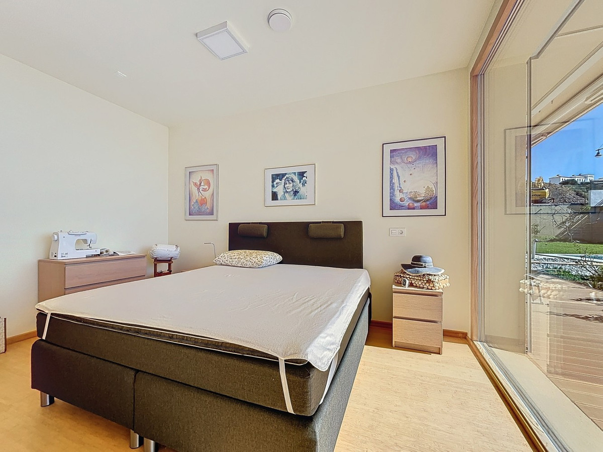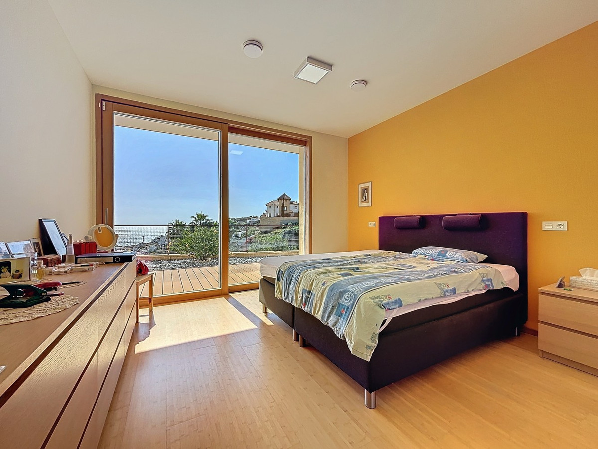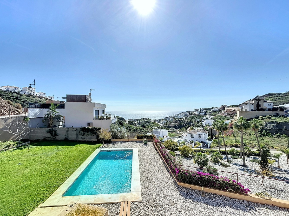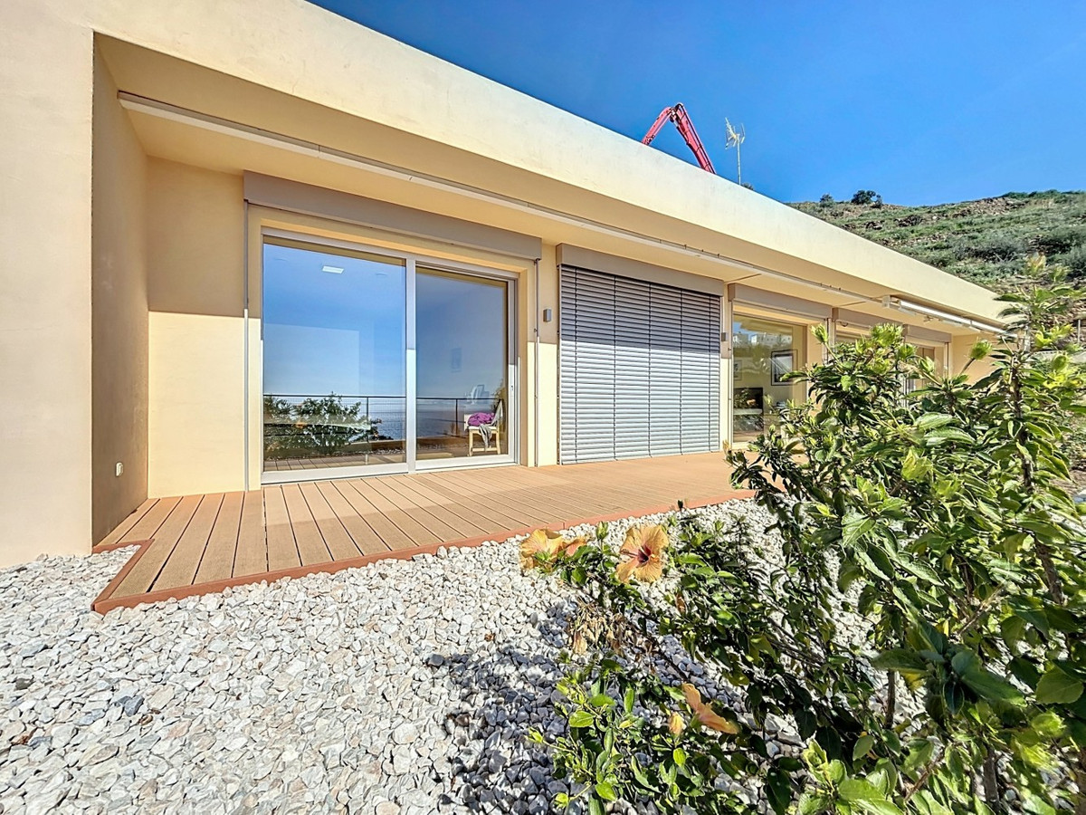 This luxurious Mediterranean villa in Torrox, Málaga, is spread across two floors and offers breathtaking sea views. The property is designed with sustainability in mind and is a true zero-energy home, maintaining a comfortable temperature year-round thanks to its high-quality insulation and comfort ventilation system. Solar panels further enhance its energy efficiency. The main floor features an open-plan living area with a sleek and modern kitchen, equipped with light-colored cabinetry and integrated appliances. The spacious living room is bright and airy, seamlessly blending indoor and outdoor spaces through large glass doors that open onto a sun-drenched terrace. This terrace offers stunning panoramic views of the sea and surrounding landscape and includes a private swimming pool, making it an ideal spot for al fresco dining and relaxation. The villa boasts three well-appointed bedrooms, including a master suite with an en-suite bathroom. The additional two bedrooms share a stylishly designed bathroom with contemporary fixtures, such as walk-in showers and floating vanities. An office space with built-in storage provides a dedicated area for work or study. A standout feature of the home is its accessibility. A lift connects both floors, ensuring comfort and convenience for all residents. The villa also includes ample storage solutions, with built-in wardrobes in the bedrooms and additional organized spaces throughout the house. Outside, the landscaped garden enhances the Mediterranean ambiance, offering a serene retreat. A carport provides secure parking. The property sits on two building plots, offering the possibility to construct additional structures if desired. Designed by the current owner, this villa incorporates unique architectural elements and thoughtful details that set it apart. Combining Mediterranean charm with modern sustainability, this home is a perfect sanctuary in the heart of the Costa del Sol. We are pleased to be able to present this dream property to you soon, either personally or via virtual viewing. Because this world is unique - just like our Axarquía. In Andalusia. On the Costa del Sol. Here, on the sunny side of life...