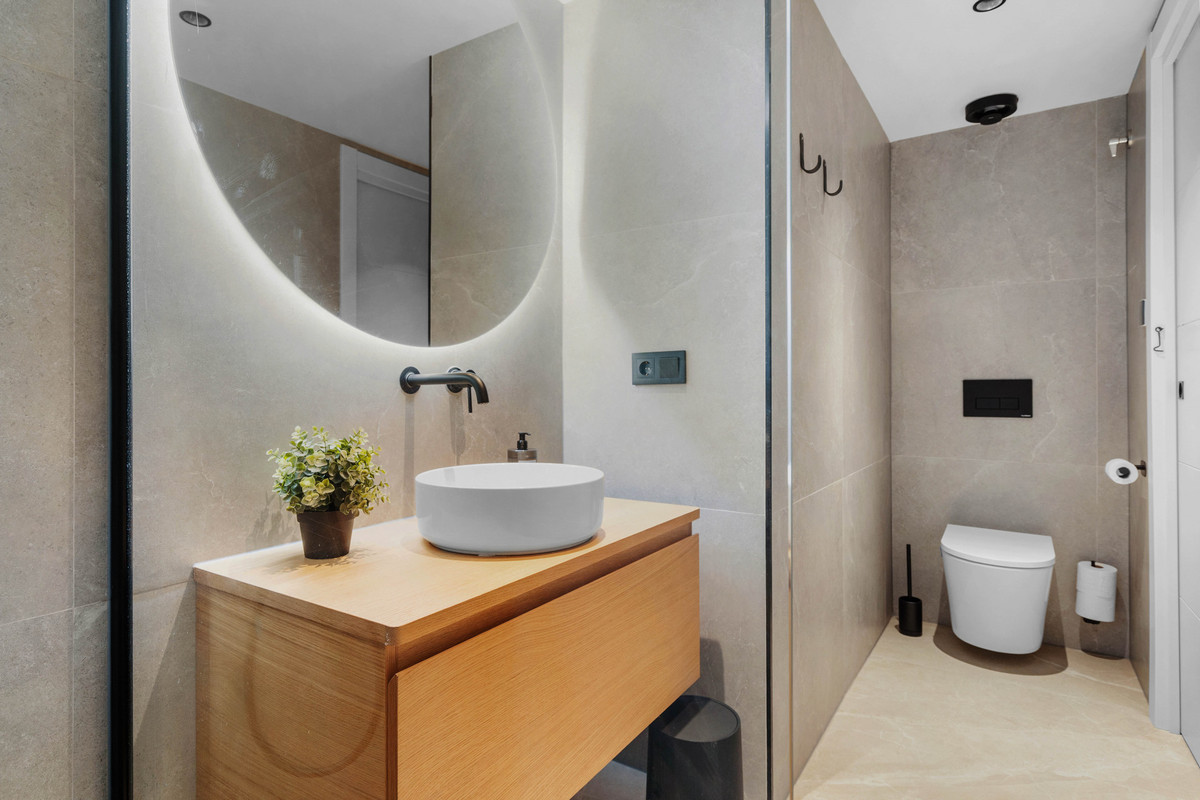 The open-plan living area is thoughtfully crafted for comfort and style, flowing seamlessly onto a spacious southwest-facing terrace — ideal for entertaining, dining al fresco, or simply relaxing in the sun. The natural light and calming design details create a welcoming and refined ambiance throughout.