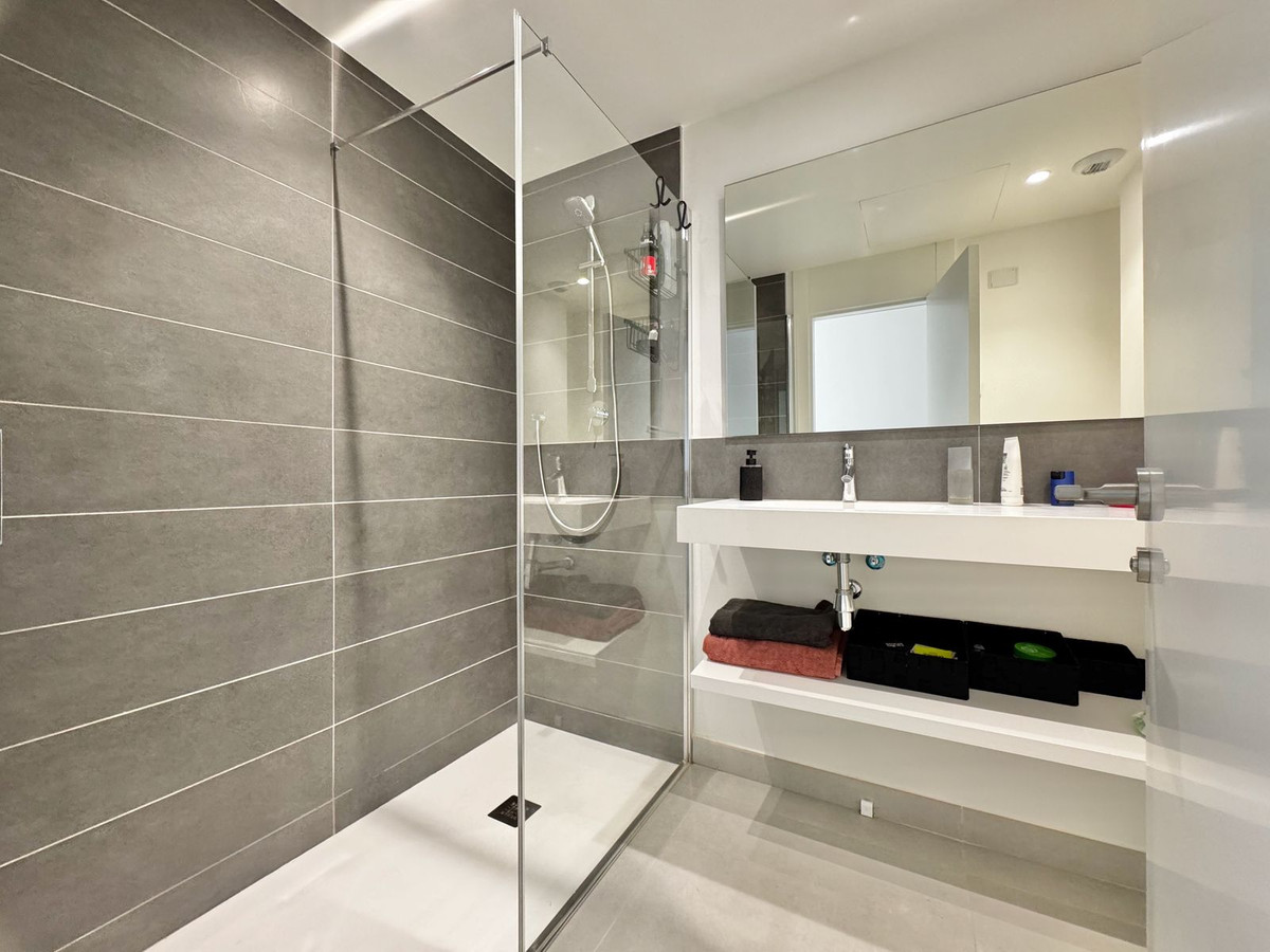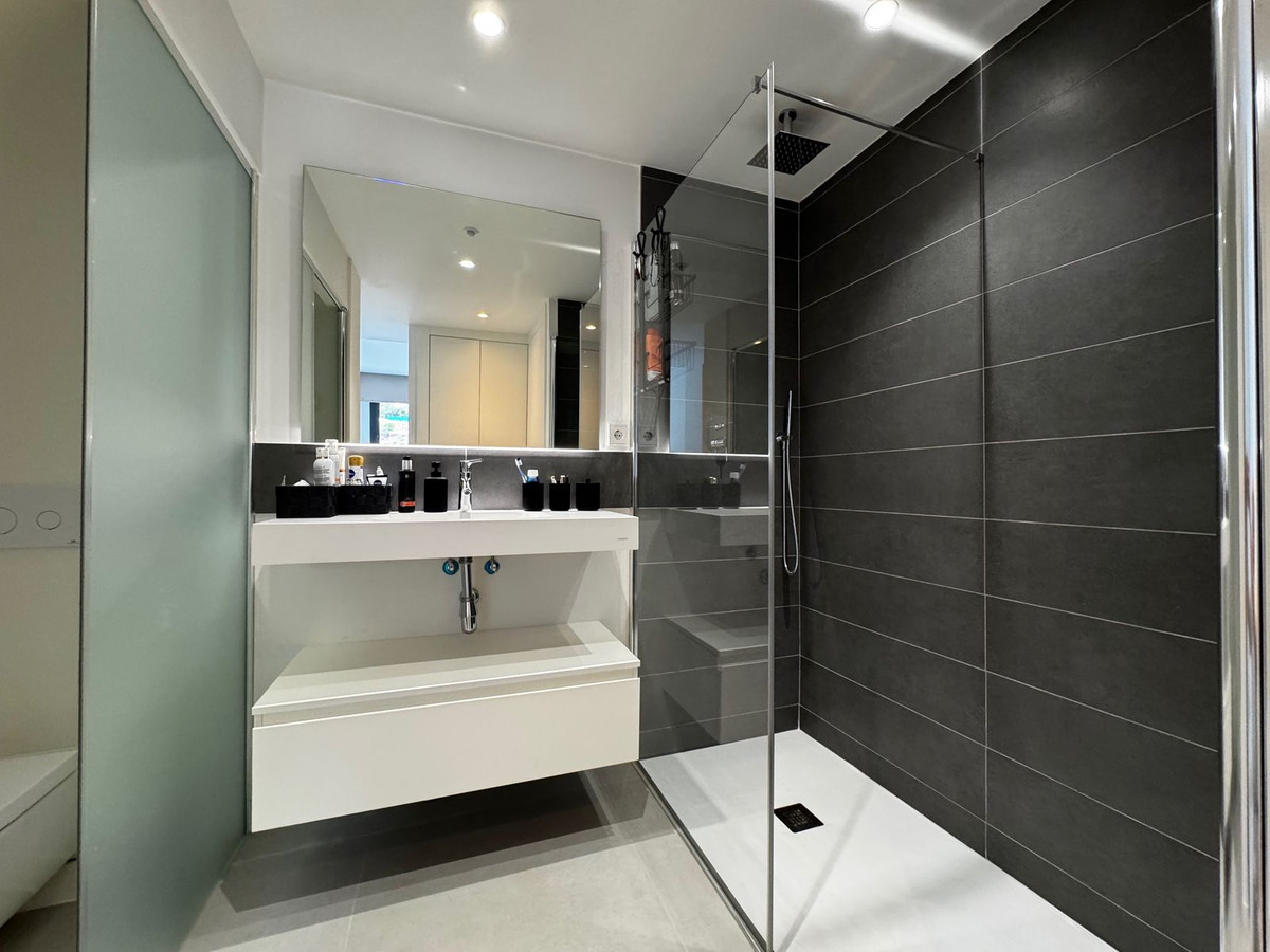 The bright open-plan living area blends seamlessly with the main terrace, creating a perfect space for alfresco dining, relaxing in the sun, or enjoying the scenery. The apartment features two bedrooms, including a master with a dressing closet, two modern bathrooms with underfloor heating, a fully equipped open kitchen with Neff appliances, a laundry room, and an entrance closet. Comfort and convenience are enhanced by electric awnings inside the apartment and on the main terrace. The apartment is fully furnished and ready to move in.