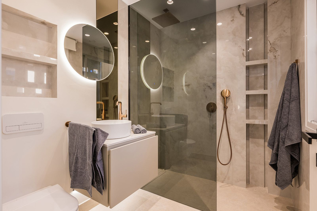 This fully remodelled 4 bedroom and 4 bathroom apartment is an amazing opportunity for people who are looking for luxury and comfort in a stunning beachfront location. The spacious living and dining room and the luxurious master bedroom with its en-suite bathroom and walk-in wardrobe both have direct access to the impressive south facing terrace with panoramic sea views. Los Granados del Mar is one of the most exclusive urbanizations on the New Golden Mile with breathtaking views of the Mediterranean Sea. Its combination of beautifully maintained gardens and luxurious facilities such as an on-site restaurant, a heated indoor pool, 2 outdoor pools, a gym, a sauna, a Jacuzzi and 24h security make this community one of a kind. It has direct beach access and is very close to all amenities, shops, schools, high class restaurants, the newly build Laguna complex and the center of Estepona. This bright 187 m² apartment boasts a brand-new open-concept designer kitchen with premium German appliances and luxurious extras, including a Bang & Olufsen sound system, an electric fireplace, and a freestanding bathtub. Underground parking with direct lift access to the apartment as well as a secure storage room are included in the price.