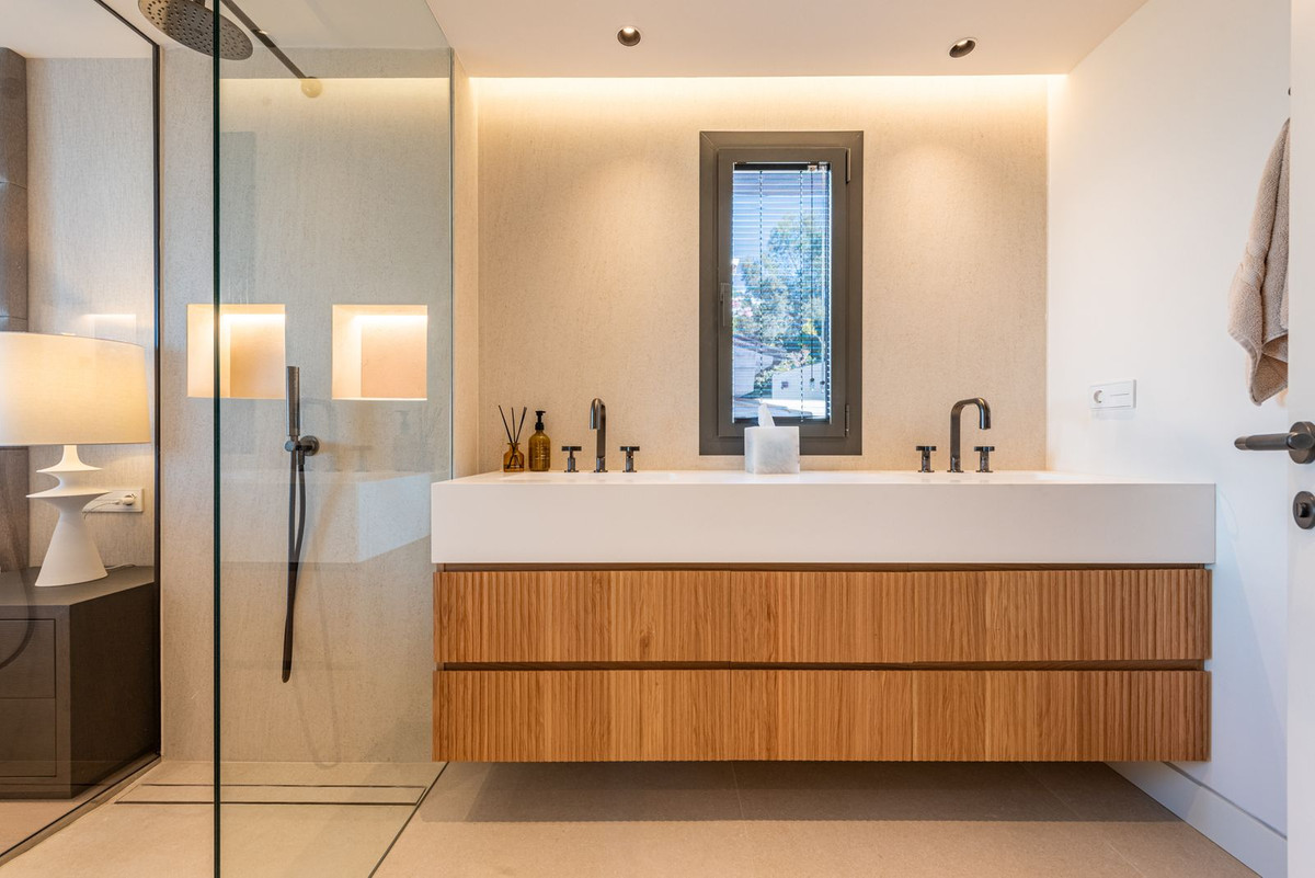 Inside, the home features three spacious bedrooms, all beautifully decorated. The master suite includes a luxurious en-suite bathroom, while the two guest bedrooms share a generously sized, elegant bathroom. On the main level, there is also a convenient guest toilet for visitors.