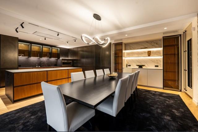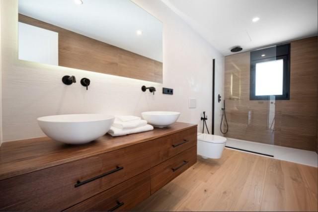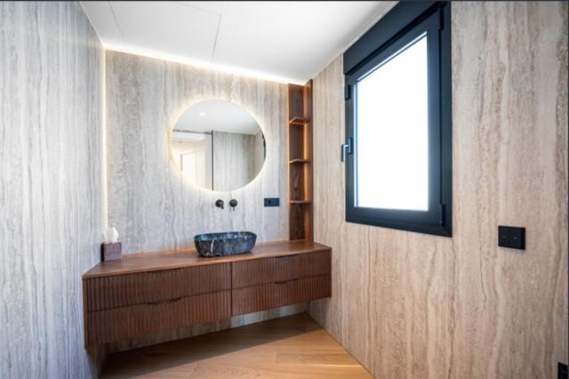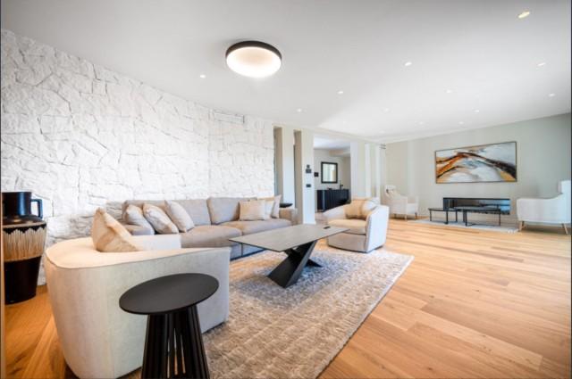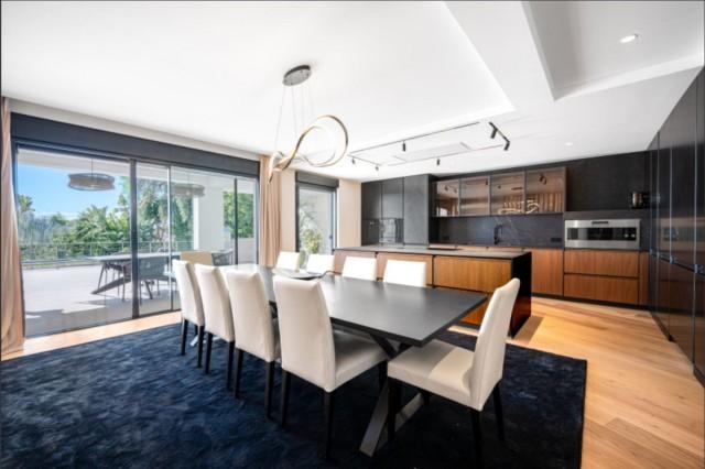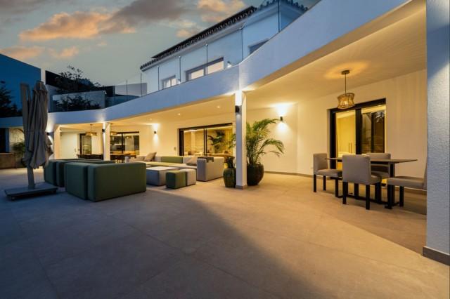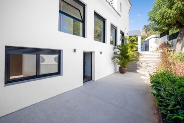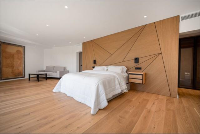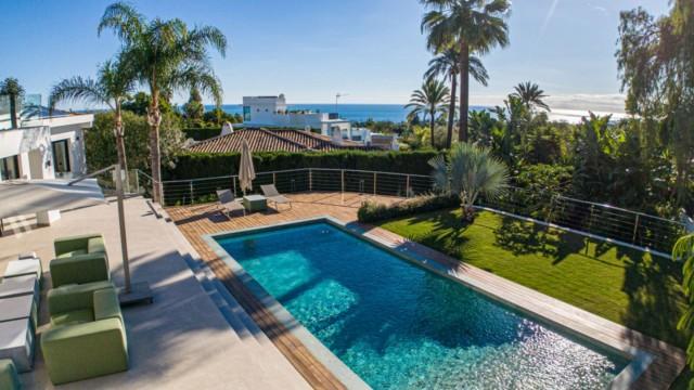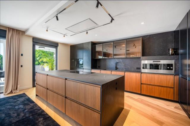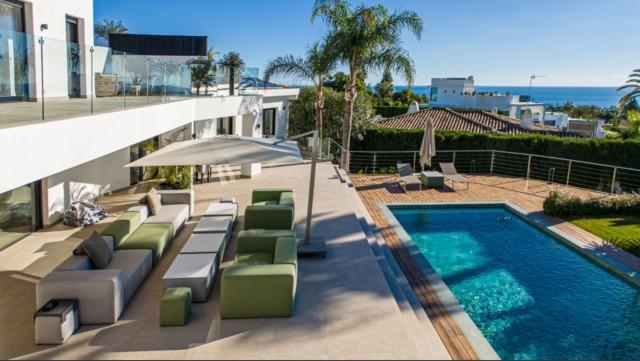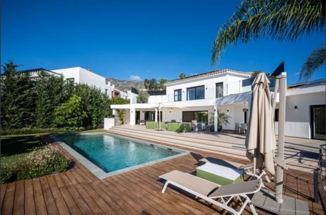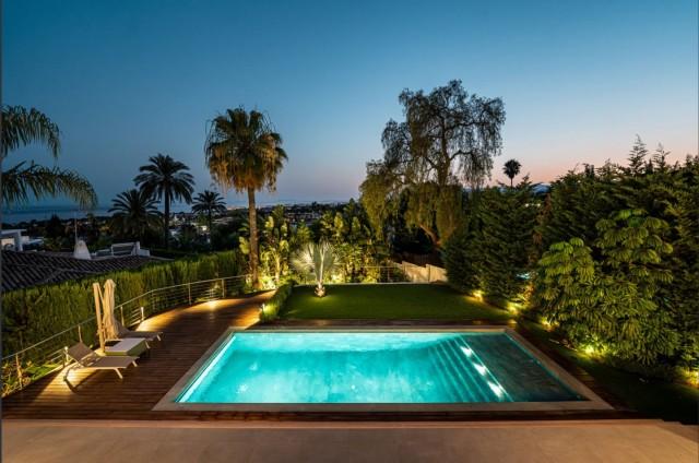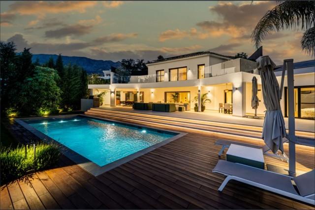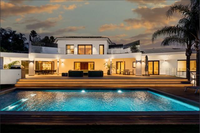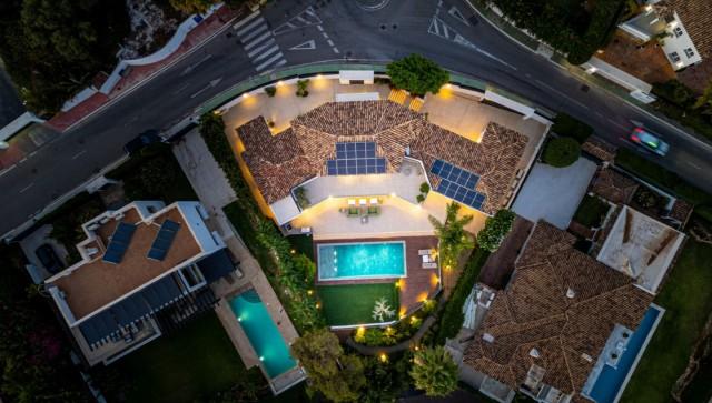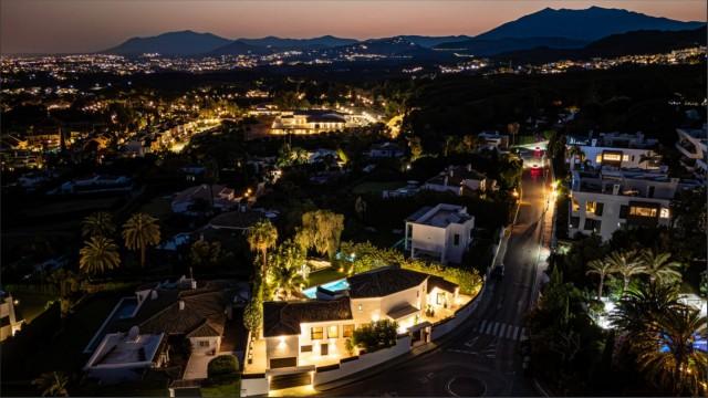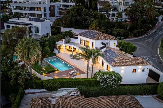 This luxury five-bedroom villa is located in the prestigious Nagüeles area. The property offers panoramic sea views, elegant open spaces, and a seamless connection between indoors and outdoors. Each room opens onto terraces and gardens surrounding a heated swimming pool, creating a private and tranquil retreat for enjoying a modern lifestyle. The main floor features a bright living room with a stone wall and a designer fireplace. The dining room, seating ten, connects to a signature kitchen in black and wood tones, equipped with concealed appliances and a second auxiliary kitchen. On this level are three en-suite bedrooms, all with direct access to the terrace and landscaped gardens. The master suite, occupying the entire floor, is located on the upper level and includes a large dressing room, two bathrooms, and a private terrace overlooking the Mediterranean. The lower level comprises a guest apartment with its own kitchen, a fully equipped gym, and a climate-controlled wine cellar. With solar panels, underfloor heating and parking for several vehicles, it effortlessly combines elegance, privacy and luxury in one of Marbella's most exclusive areas.