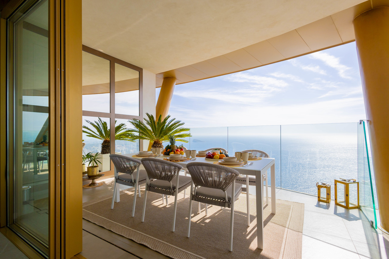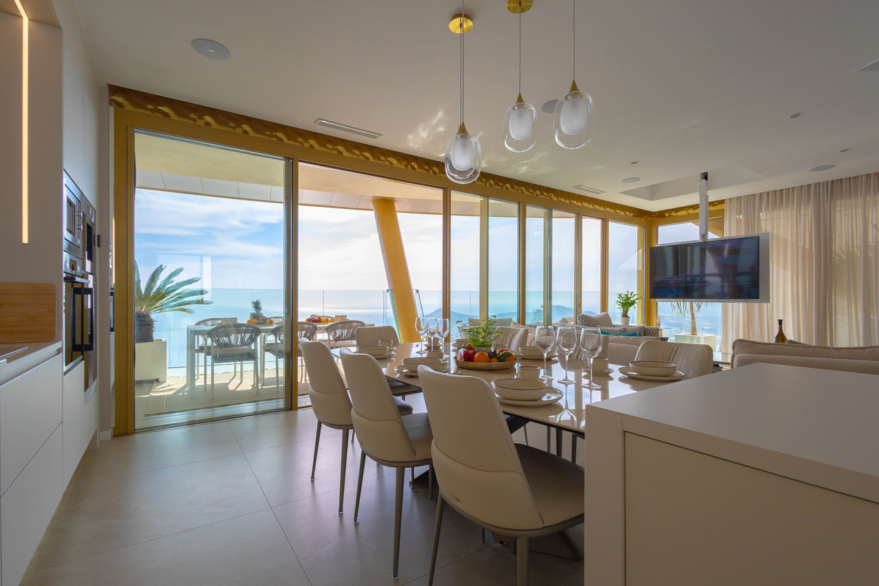 This corner property features an impressively spacious living area, a designer open-plan kitchen, a separate laundry room, three large bedrooms, and two or three bathrooms, including a stunning master suite with its own private bathroom. Its crown jewel is the expansive panoramic terrace, offering breathtaking views of the sea, the bay of Benidorm, and the most iconic skyline on the Spanish coast.