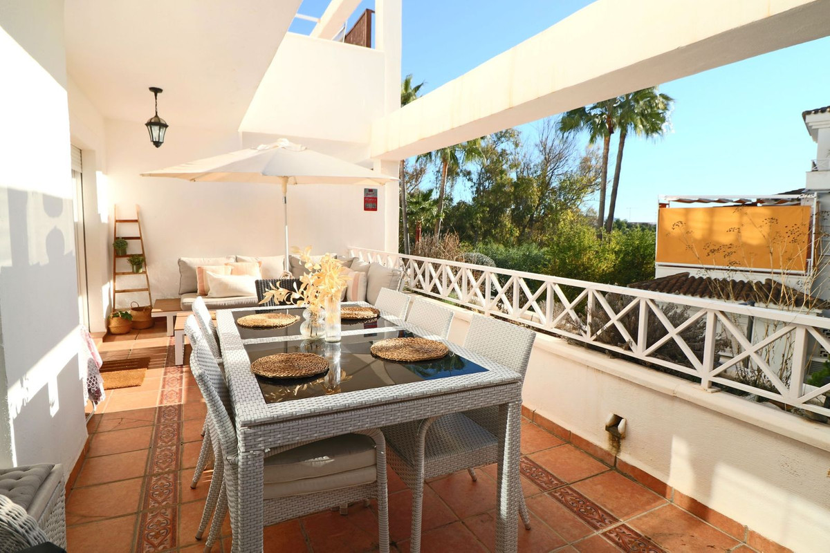 Magnificent southeast-facing two-bedroom apartment in Marbella, located in an exclusive private residential complex offering two swimming pools and spacious communal gardens, just a few steps from the beach and the Río Real golf course. This property, located on an elevated first floor, stands out for its spacious terrace with pleasant views of the green areas. Inside, it is distributed in an entrance hall, a spacious living-dining room with direct access to the partially covered terrace, a large separate kitchen with access to a generous laundry terrace, two bedrooms—the master bedroom being particularly spacious and bright thanks to a large window—and a bathroom. It also includes a large storage room and a parking space.