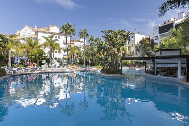 Large apartment very close to the beach in Los Jardines de las Golondrinas in Elviria in East Marbella, just next to the hotel Don Carlos and the Rafa Nadal Tennis Academy. The apartment located on a first floor offers in total three bedrooms plus a small guest bedroom, three bathrooms, a fully equipped kitchen and a ample and bright living and dining room with south orientation. AC hot and cold and open fireplace and also including a car park space and a storage room. Amazing frontline beach complex with 24hrs. security, stunning communal pool and tropical gardens. Within walking distance to all local amenities. The centre of Marbella is only a short drive away.