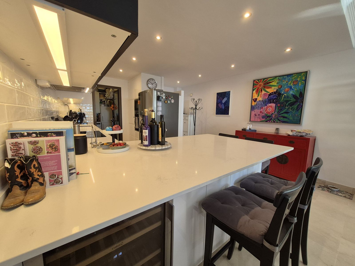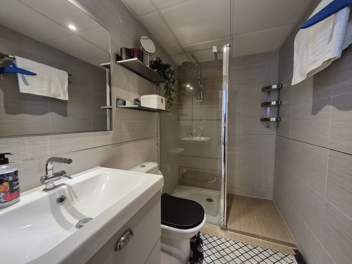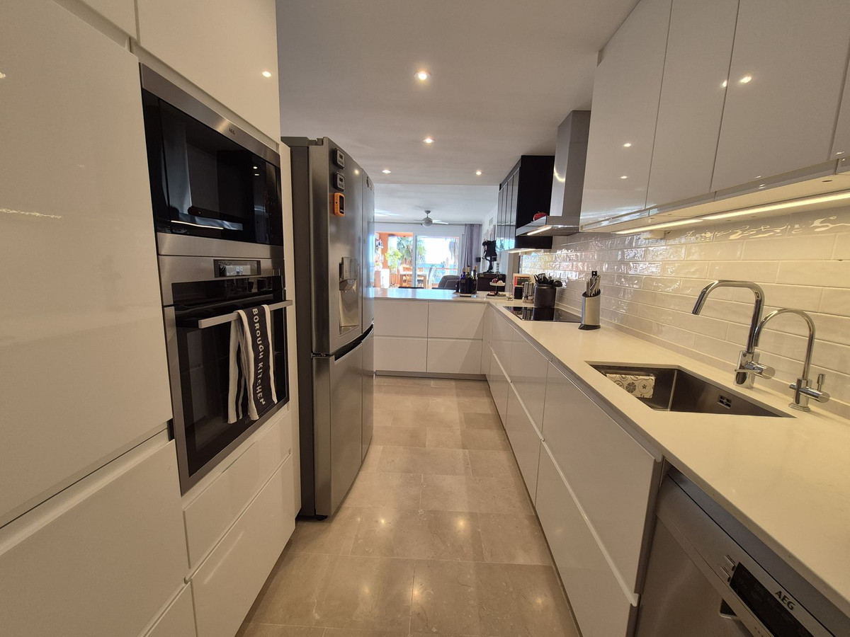 The kitchen is a good size and has been nicely renewed. The property also comes with a new AC unit, a new shower in the guest bathroom, and ceiling fans in the living room, main bedroom, and on the terrace.