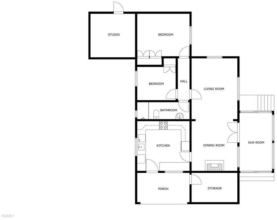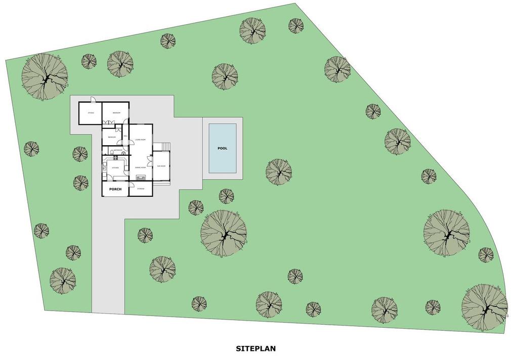 The single-story, self-built family home features a covered porch, two bedrooms, a bathroom, living-dining room, kitchen, storage room, and an additional porch.
