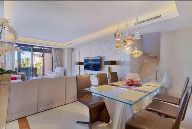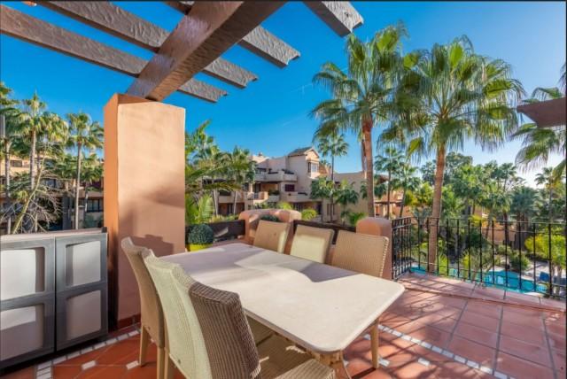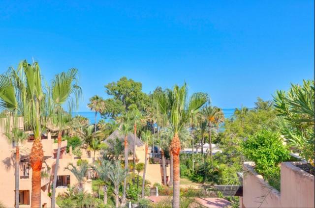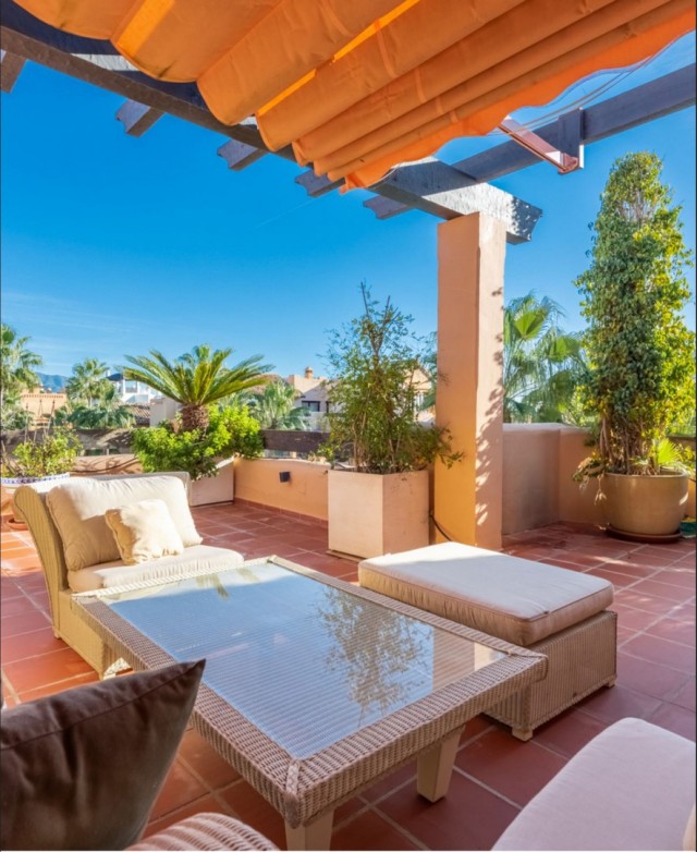 This stunning, fully renovated duplex penthouse offers a luxurious coastal retreat just steps from the promenade and beaches of San Pedro de Alcántara. Facing southeast, it enjoys abundant natural light and captivating views of the communal gardens and the Mediterranean Sea. The main floor features a partially renovated kitchen with high-end appliances and an integrated utility room, along with a spacious living room and a guest bedroom, both with direct access to the main terrace.