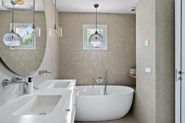 The main floor features an elegant open-plan layout that connects a custom-built Nordic kitchen with a spacious living and dining area. Large doors open directly to the private garden, where you will find an outdoor dining corner, built-in barbecue, and your own relaxing sauna-perfect for enjoying the Marbella lifestyle from morning to evening.