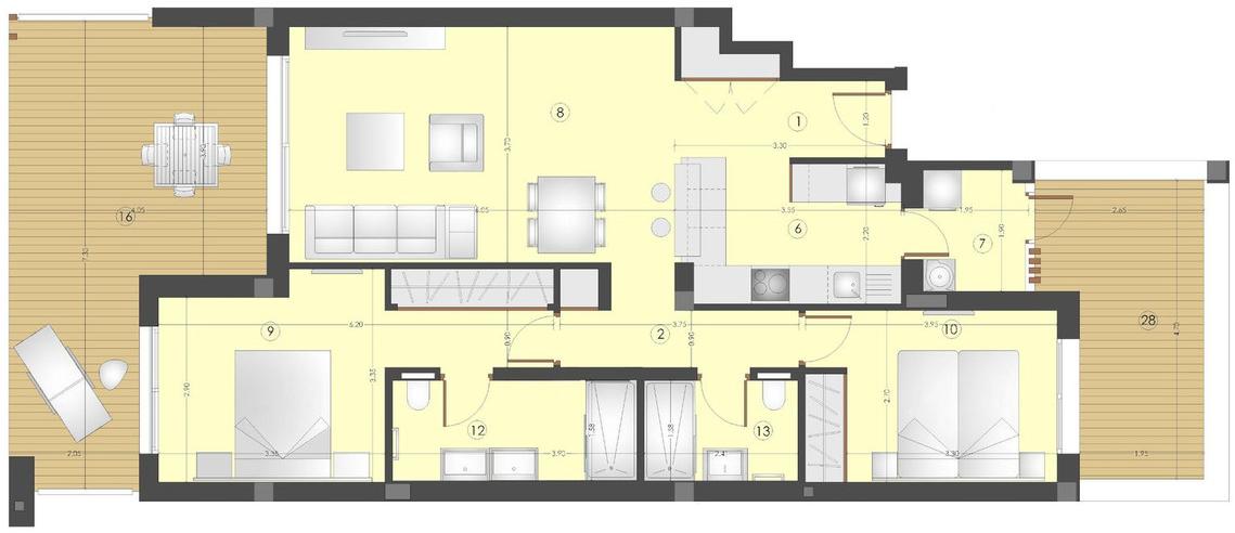 The private outdoor area is a true highlight, thoughtfully divided into three distinct zones for ultimate comfort and relaxation: