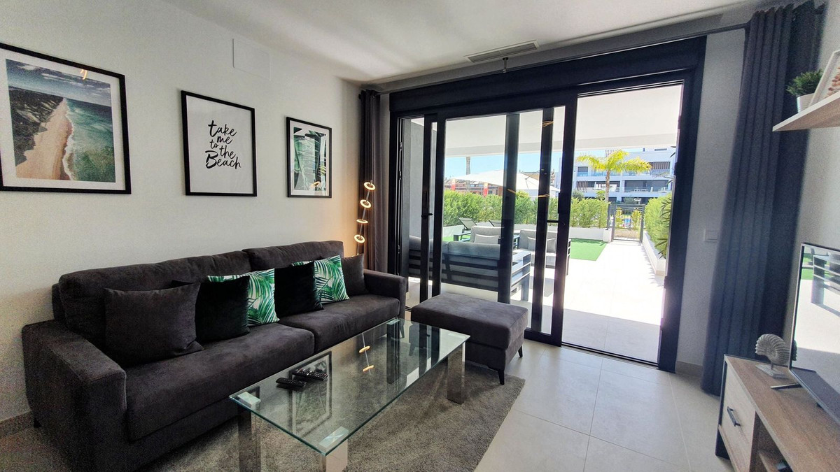 The garden connects directly to the tranquil communal areas featuring beautifully landscaped Mediterranean gardens, swimming pools, jacuzzis, and a children’s play area.