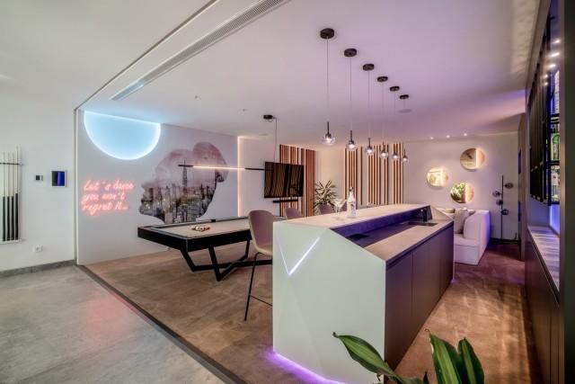 This villa boasts a private spa with a heated indoor pool, sauna, steam room, and massage area. A fully equipped gym with Eleiko equipment allows you to stay active without leaving home, while the spacious entertainment room provides the ideal setting for movie nights, game nights, or simply relaxing with family and friends.