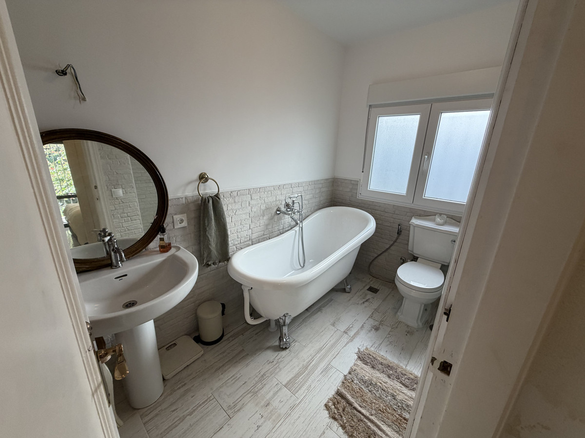 The property is arranged over two levels and offers three terraces distributed across both floors. It currently features two bedrooms, with the option to convert it into a three-bedroom home. Each level is configured as an independent unit, including one bedroom, one bathroom and a kitchen on both the ground and upper floors; however, the house can easily be renovated into a single, unified property. The spacious living room provides direct access to the terrace and garden, ground floor bathroom has been newly renovated. This home gives you the freedom to redesign and renovate the interior according to your personal preferences.