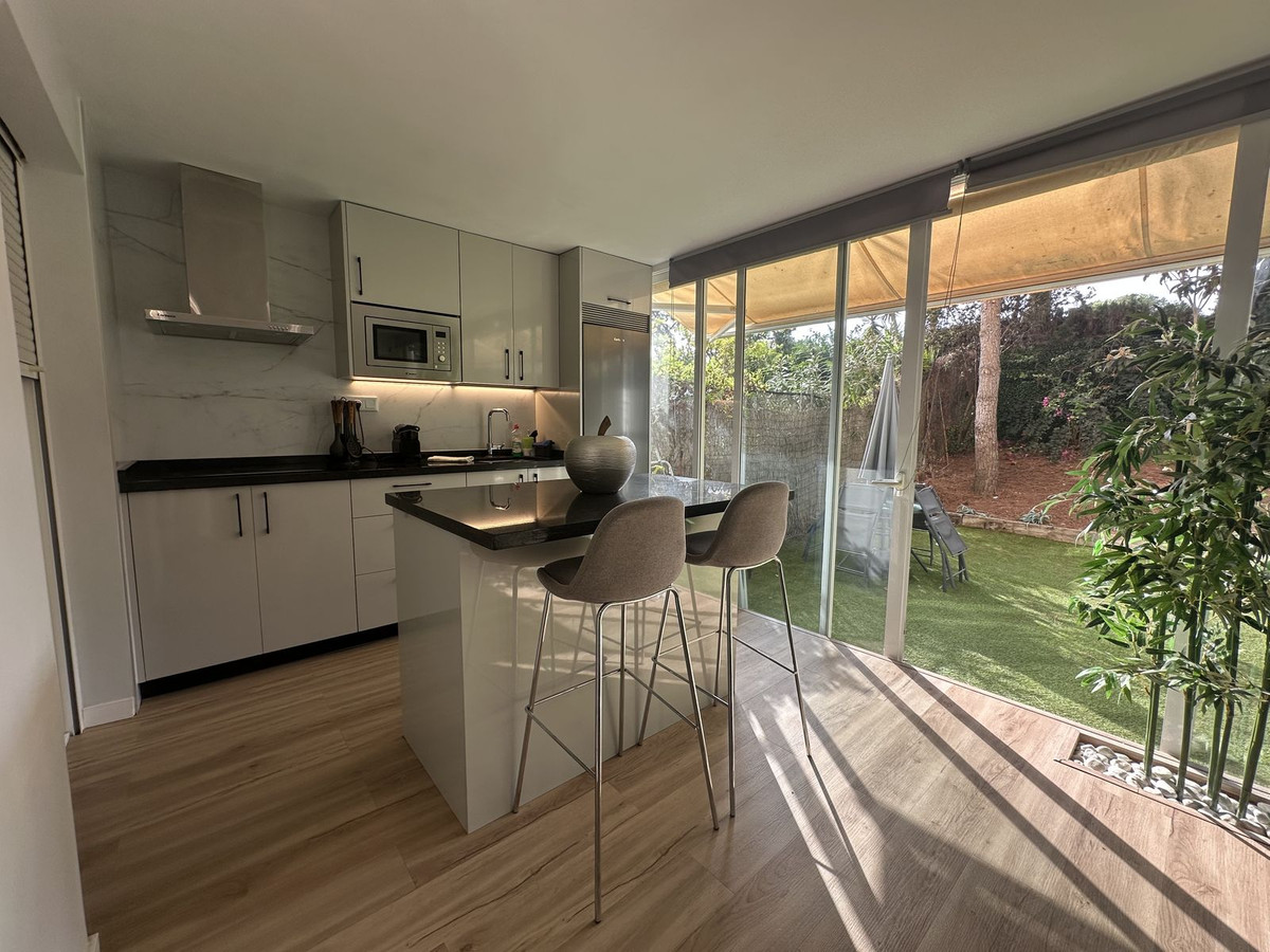 Discover this beautifully renovated ground floor apartment in the exclusive urbanization of Calahonda Royale, ideally located just a short walk (200m) from the stunning beaches of Cabopino and the lively area of Calahonda.