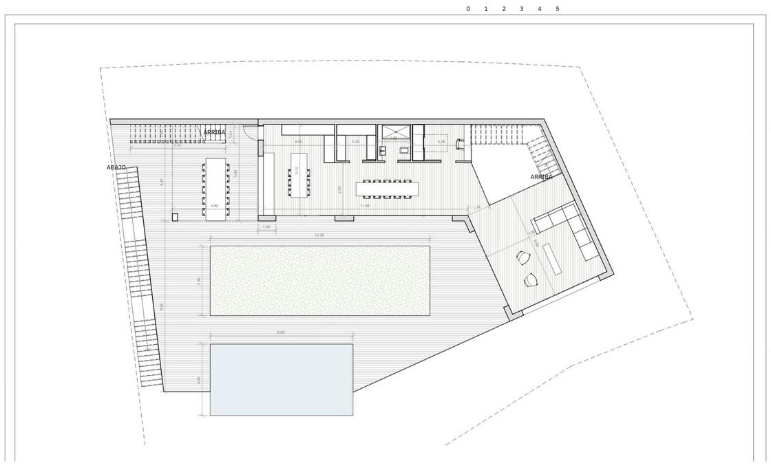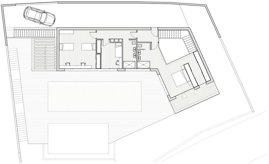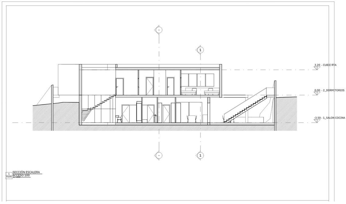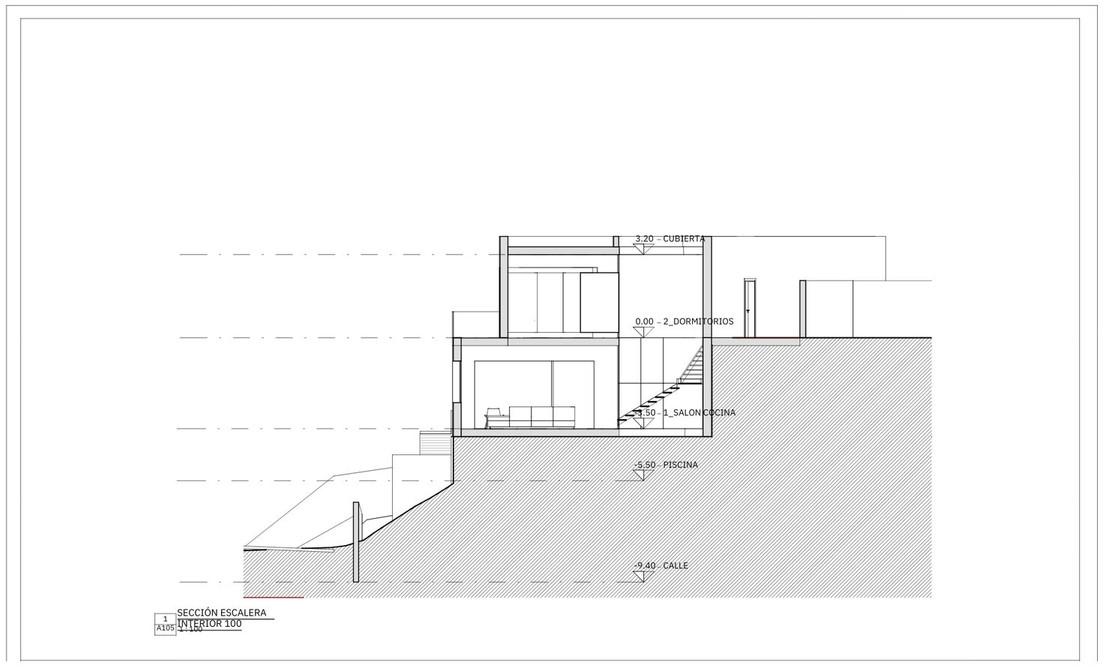 The projected dwelling is modern and functional, with two levels arranged around a side patio that provides illumination and ventilation.