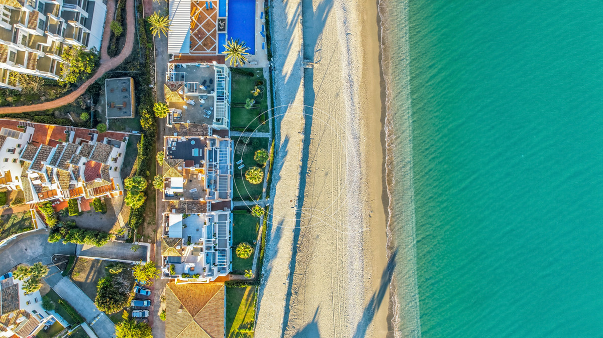 The complex features classic Andalusian architecture, a large communal pool surrounded by lush greenery, and direct access to the beach and seaside promenade, ideal for leisurely walks, cycling, or simply enjoying the Mediterranean climate.