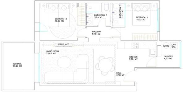 The apartment spans 100 m² of interior space plus an 11 m² south-west facing terrace that captures panoramic sea views and abundant sunlight throughout the day. The bright open-plan living and dining area flows seamlessly onto the terrace, creating the perfect setting for relaxing or entertaining. A modern electric fireplace adds a touch of warmth and character to the elegant interior.