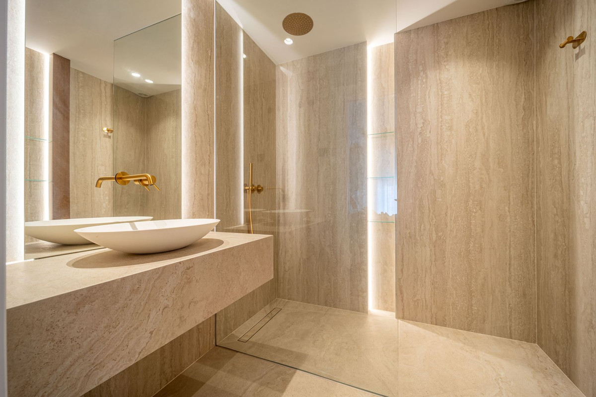 Leading into the master bedroom of the home, you have a vast master suite with a quad fitted wardrobe to match the other bedroom, it has been carefully designed to allow enough storage for a variety of clothing, including a dedicated bag display to the right hand side. This bedroom benefits from a private terrace where you can sit and look across Las Brisas golf course. The master ensuite is designed in the same high end way as the other but with added space, more solid oak panels and natural light that is let in through from the rear of the property. It has also been designed to include a separate his and hers sink upon the vanity unit.