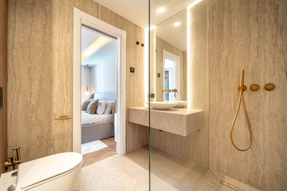 As you step upstairs into the property, you are met with a large landing comprised of the beautiful oak herringbone with bespoke bannister, to the left you will find the guest bedroom which is a very well proportioned room with custom backlit glass wardrobes featuring a linen interior to match the bedroom wallpaper. This bedroom has its own ensuite bathroom that features floor to ceiling travertine tiling, backlit niches with floating glass shelving, underfloor heating and a matching vanity unity with a full height bespoke backlit mirror.