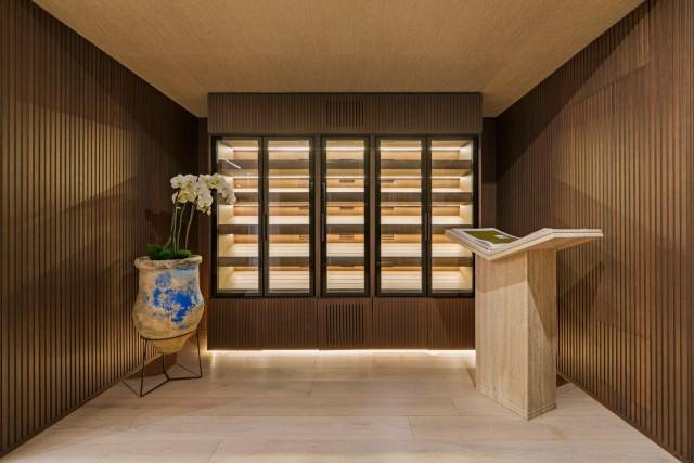 On the main living floor, the villa unfolds around a series of elegant formal and informal living areas, a dedicated dining room and a fully fitted kitchen. A guest suite and a climate-controlled wine cellar complete this level. Large sliding glass doors open directly onto the expansive terraces and infinity pool, allowing seamless indoor-outdoor living and ensuring that the breathtaking southwest-facing views remain a constant presence throughout the day.