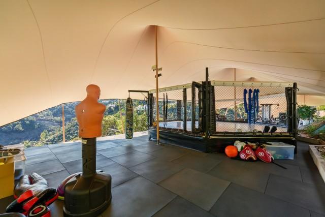 One of the most distinctive features of this property is the fully equipped outdoor gym, professionally fitted and complete with a boxing ring. Positioned at the edge of the plot, it offers a unique private training environment with open views across the surrounding hills and coastline.