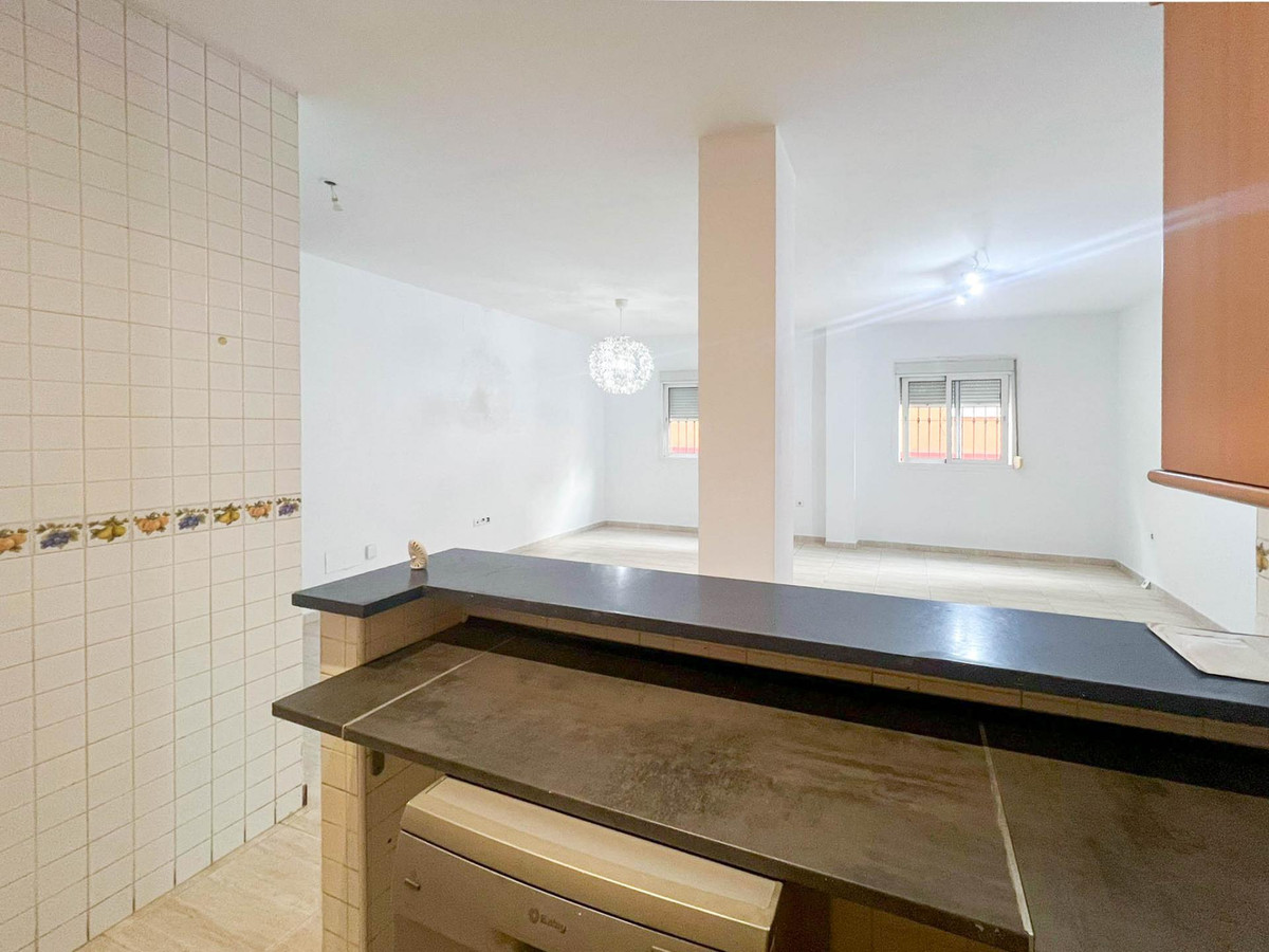 The next room is a huge living room, with many possibilities for decoration, including conversion into a third bedroom or study area, or adaptation to the client's needs. The kitchen is open plan, with a bar that extends directly into the living room. It is fully equipped, but also has many possibilities for improvement.