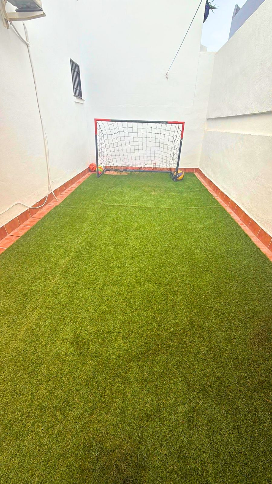 One of the main highlights of this property is its private outdoor space, ideal for enjoying the Mediterranean climate. As shown in the photos, the exterior includes a tiled terrace perfect for outdoor dining or relaxing, as well as an additional area with artificial grass, ideal for families, pets, or simply creating a green and peaceful atmosphere.