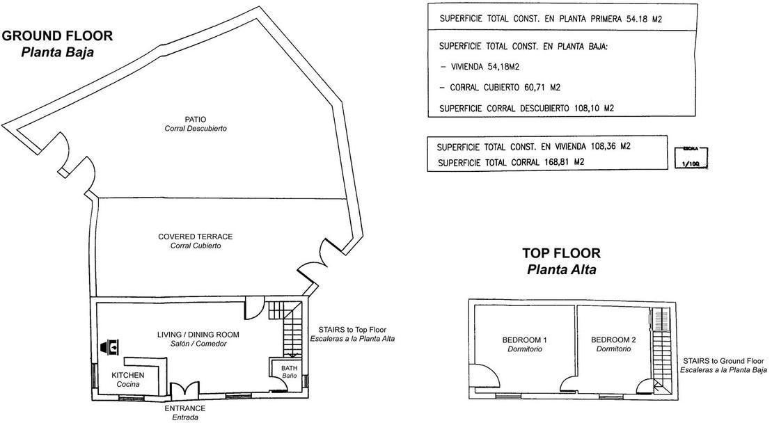 The house is built over 2 storeys. On the ground floor, there is a living room, kitchen, and a bathroom, with access to a covered terrace and a large patio (currently used as a pen for the animals).