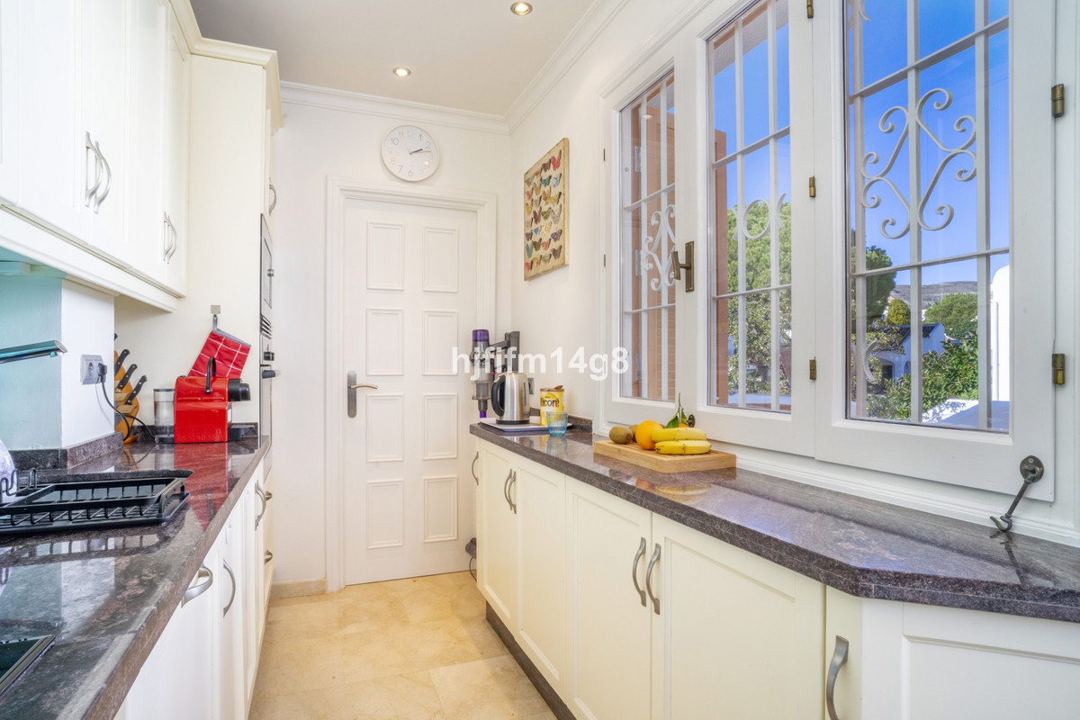Upon entering the penthouse, you are welcomed by a private patio that sets a warm and tranquil tone before stepping inside. The interior features a combined living and dining area that flows naturally onto a sunny terrace. From here, you can enjoy lovely views of the iconic La Concha mountain, the lush communal gardens, the swimming pool area and the fairways of Aloha Golf Course, creating an ideal spot for relaxing or entertaining.