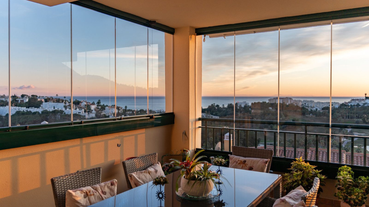 Apartment located in a well-established residential development next to Torrequebrada Golf, offering a comfortable and well-planned layout. The property features bright, generously sized living spaces, with the main living area opening directly onto an enclosed terrace fitted with glass curtains. From here, there are open views over the surrounding green areas and partial sea views in the distance. The interior is practical and well maintained, suitable for both permanent living and holiday use.