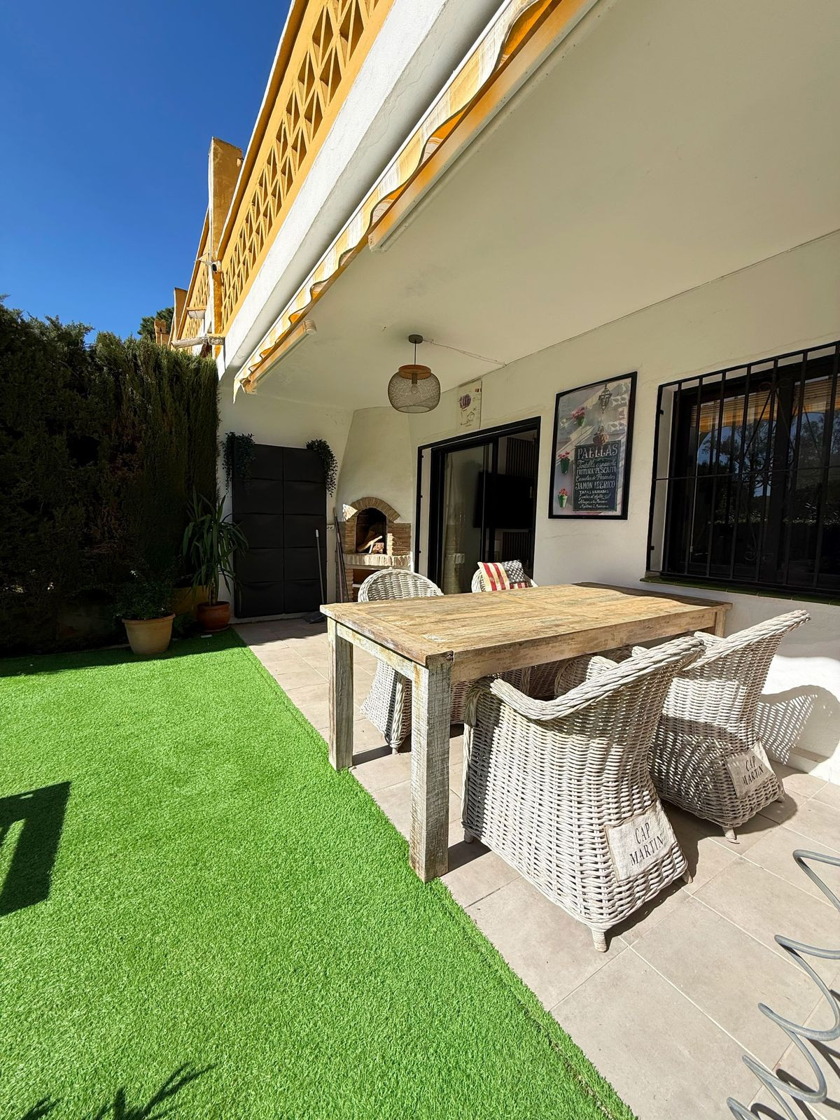 The outdoor area features a covered porch with fireplace, perfect for year-round enjoyment. From the garden there is direct access to the communal swimming pool. Additionally, the side of the property offers a private area that can be adapted to different uses.