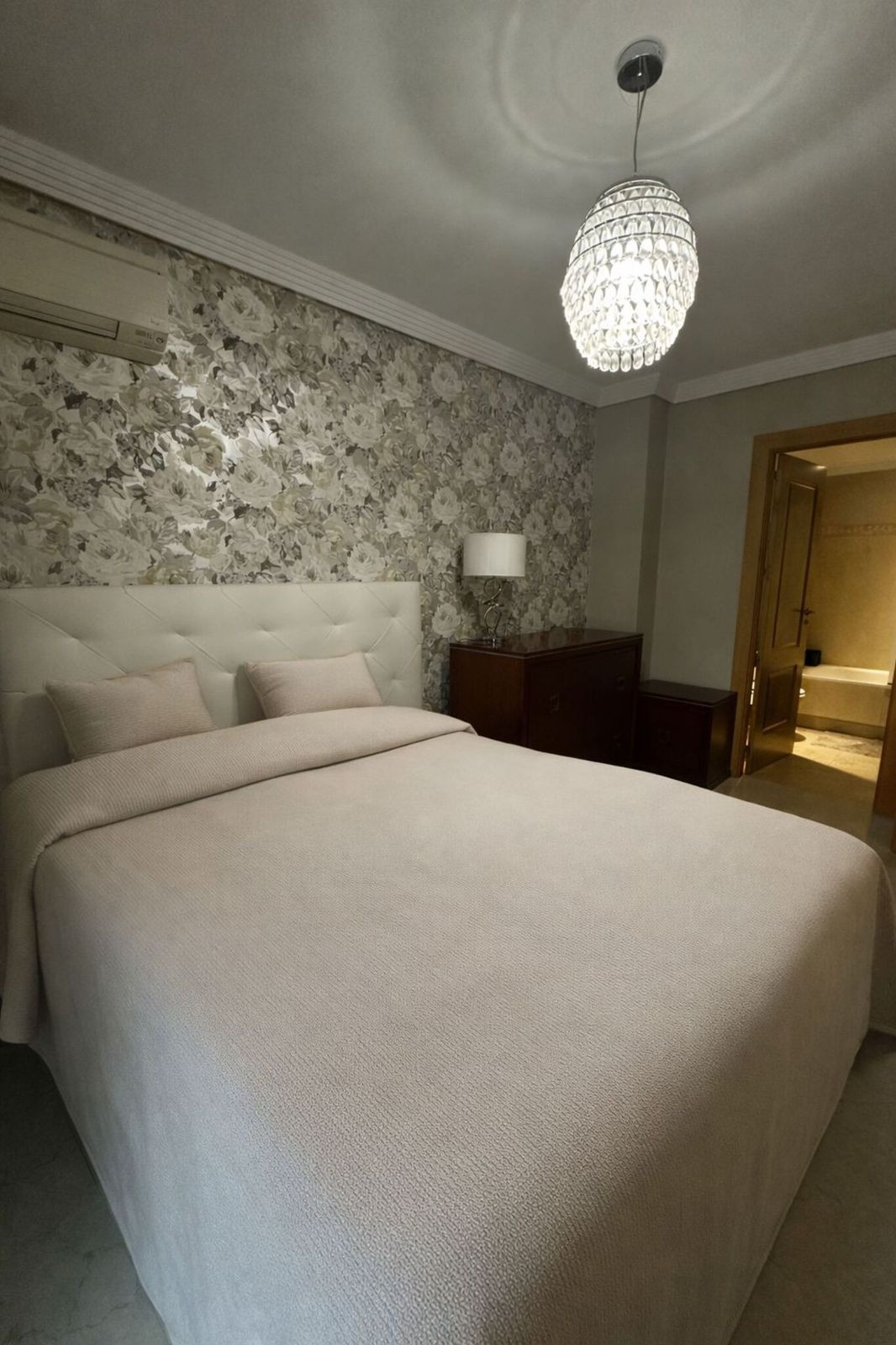 The interior layout offers two bedrooms and two bathrooms, including a master bedroom, a spacious living-dining room with a very cozy atmosphere, and a generously sized separate kitchen. The property has been modernized with a contemporary kitchen, renovated bathrooms, good quality flooring, and a neutral and elegant aesthetic. It has air conditioning, well-designed lighting, and practical storage solutions.