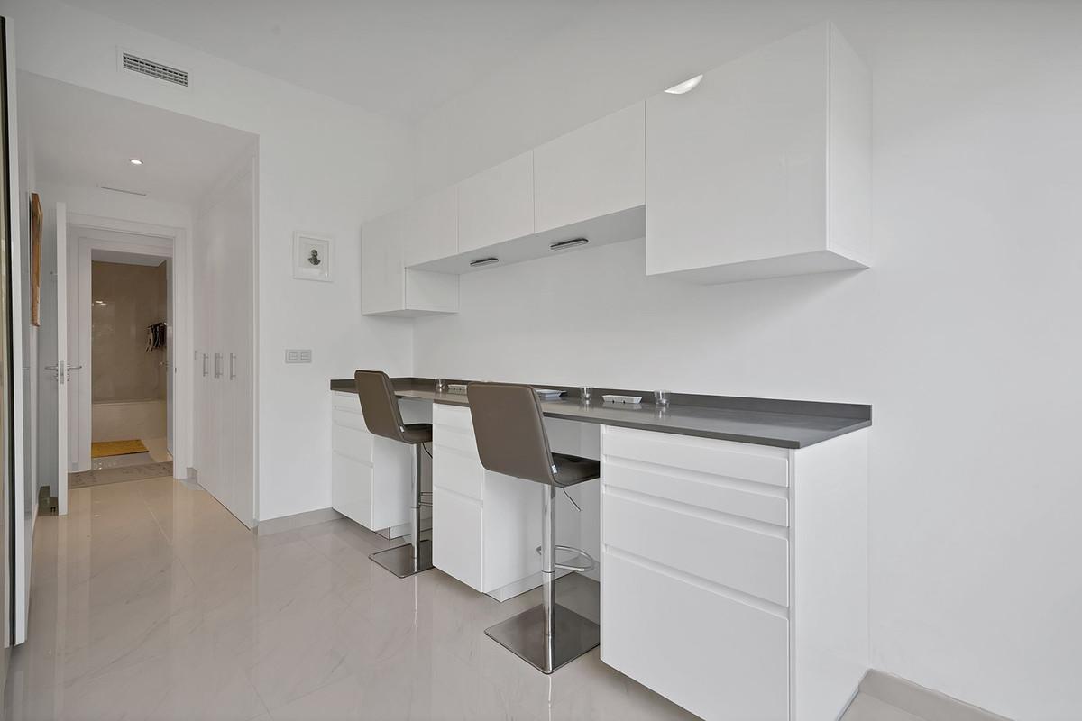The open-plan kitchen is a standout feature, showcasing a bespoke central island with quartz counter-tops and fully integrated, top-of-the-range appliances—perfect for both everyday living and entertaining. Every detail has been carefully considered, from the advanced air conditioning, heating, and air purification system to ceiling fans installed in all rooms, ensuring comfort in every season.