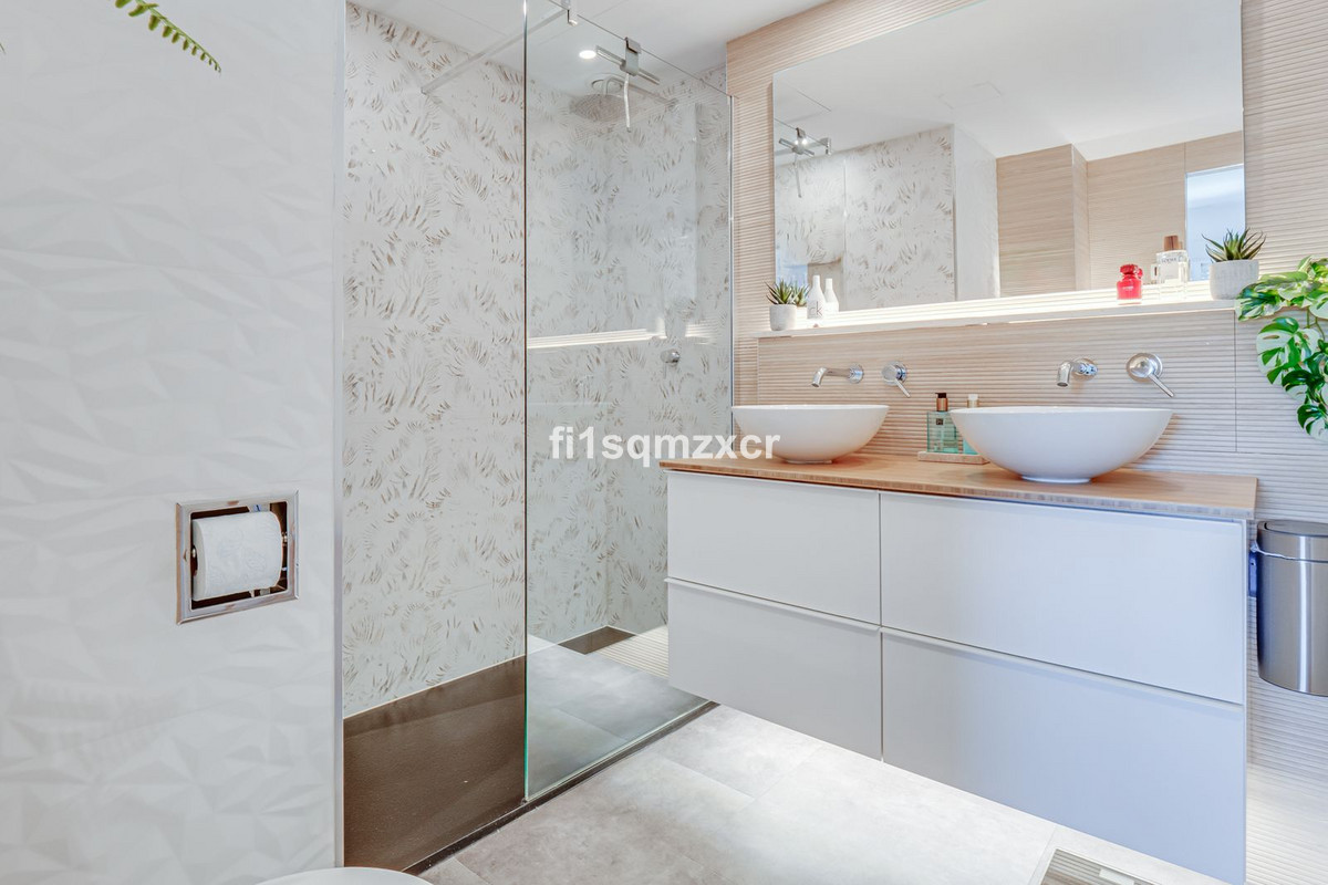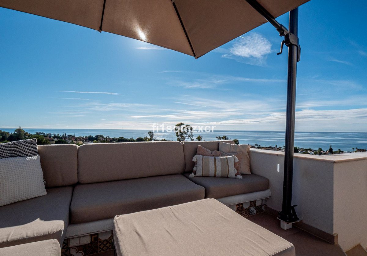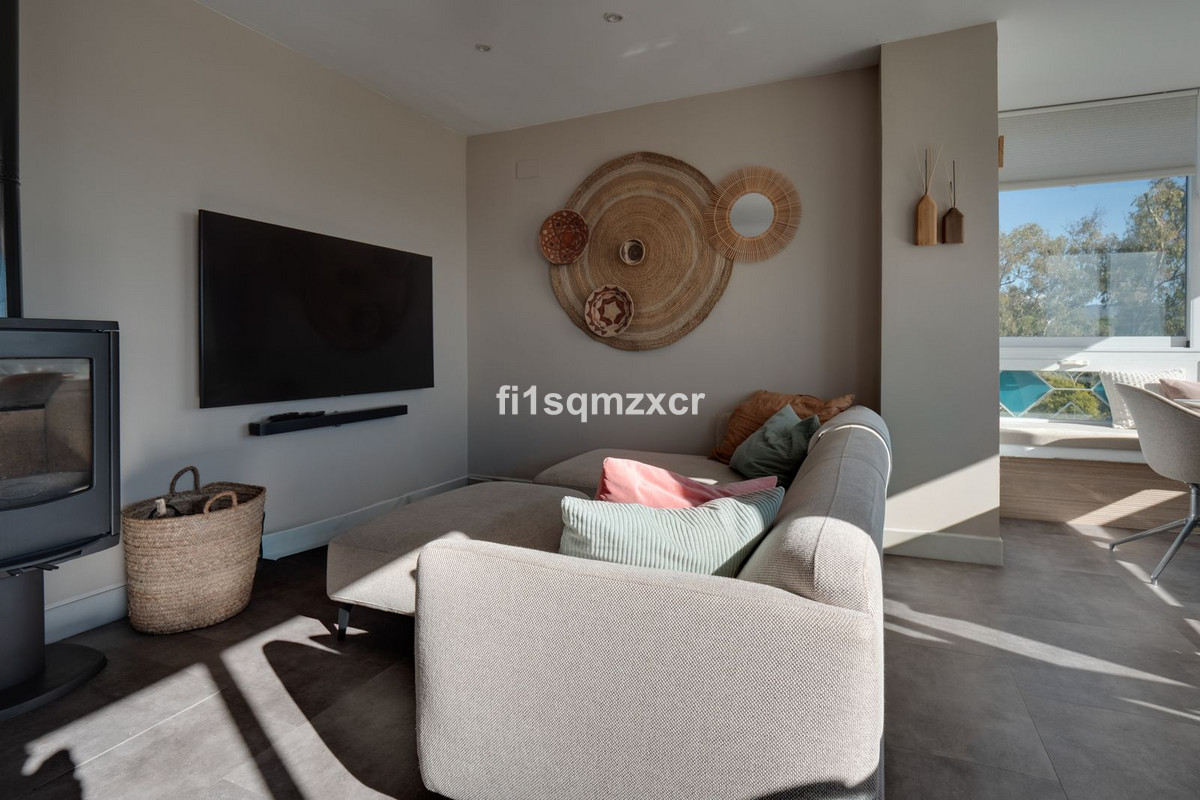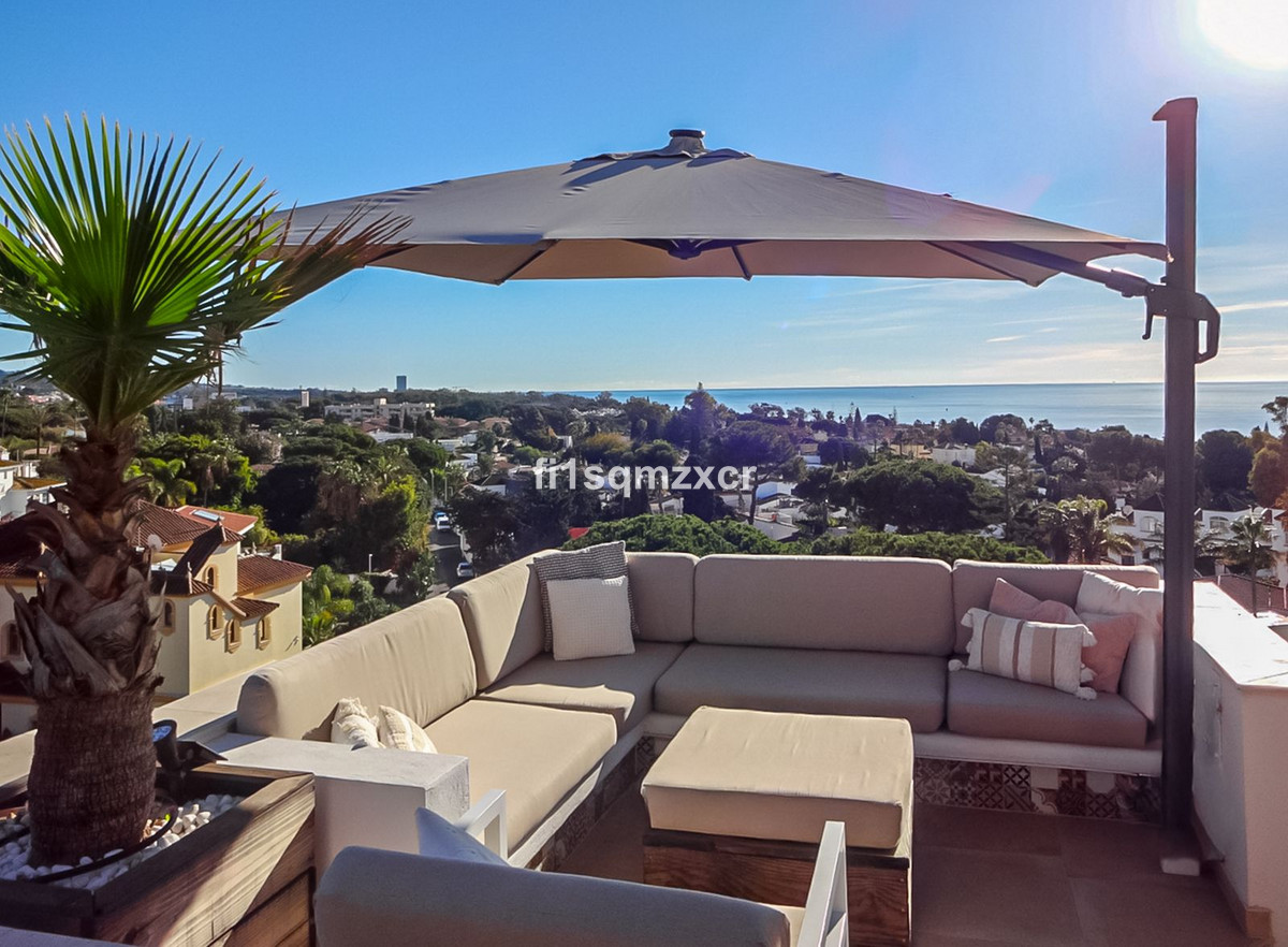 This unique corner penthouse with extraordinary views is located just a few minutes' walk from one of Marbella's most beautiful beaches, home to the best beach clubs, chiringuitos, and beach restaurants. The property has been completely redesigned and modernized with the finest materials. From the entire property, you have spectacular views of the entire coastline, Africa, and the mountains. Fourth floor: Hallway/entrance with stairs to the upper floor, guest toilet, new modern kitchen with a bar and high-quality appliances, a TV corner with a wood-burning stove for romantic evenings, a large L-shaped dining area with panoramic views, a bedroom, and a spacious bathroom.
