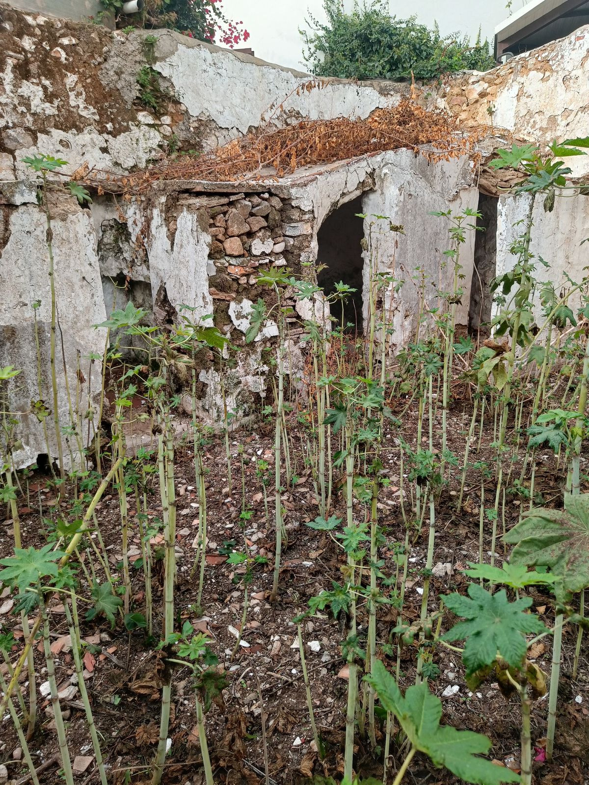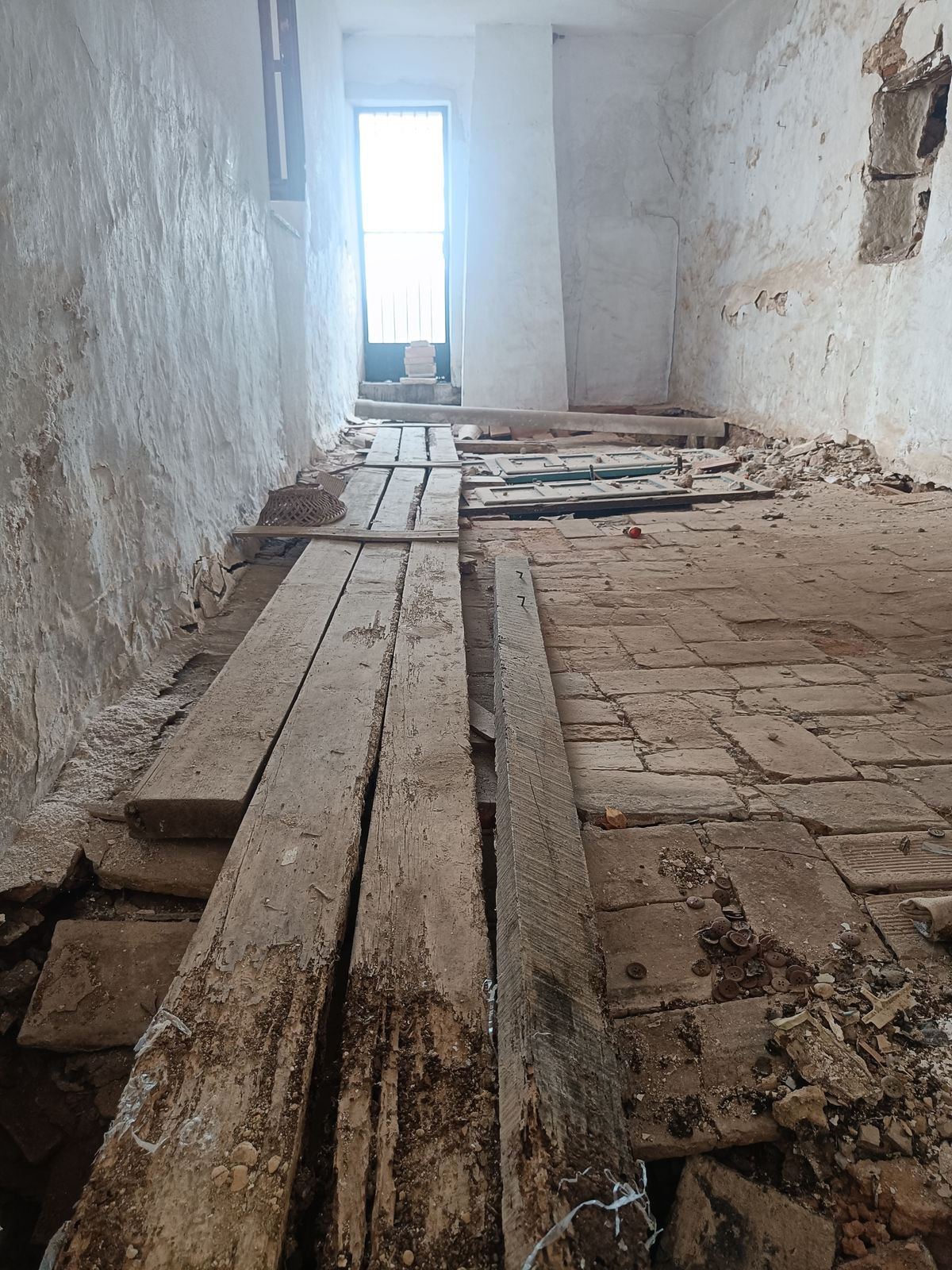 The ground floor features a spacious entrance hall, a bedroom, and the former kitchen area. From here, you can access a patio with an outdoor bathroom and a secondary entrance leading to a small private garden, perfect for enjoying the Mediterranean climate.