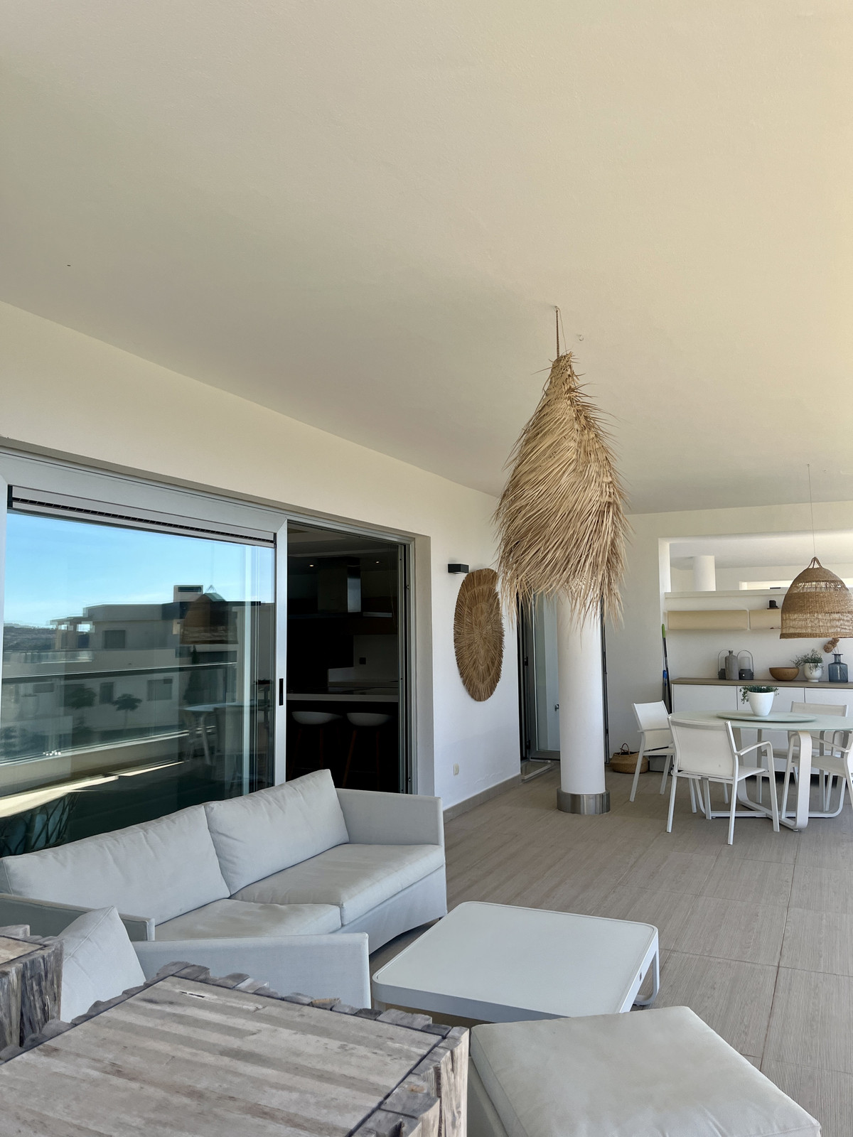 The home, with a built area of 101m²,and a terrace of 103m2 boasts an open and bright layout. The fully equipped kitchen is harmoniously integrated with the living room, creating an elegant common space ideal for leisure and socializing. High-end finishes include marble floors, built-in wardrobes, and an air conditioning system. The property is offered for sale in excellent condition. Additional features include high-speed internet access (Wi-Fi), Smart TV, elevator, and a private terrace overlooking the lush gardens and the heated communal pool, perfect for year-round enjoyment.