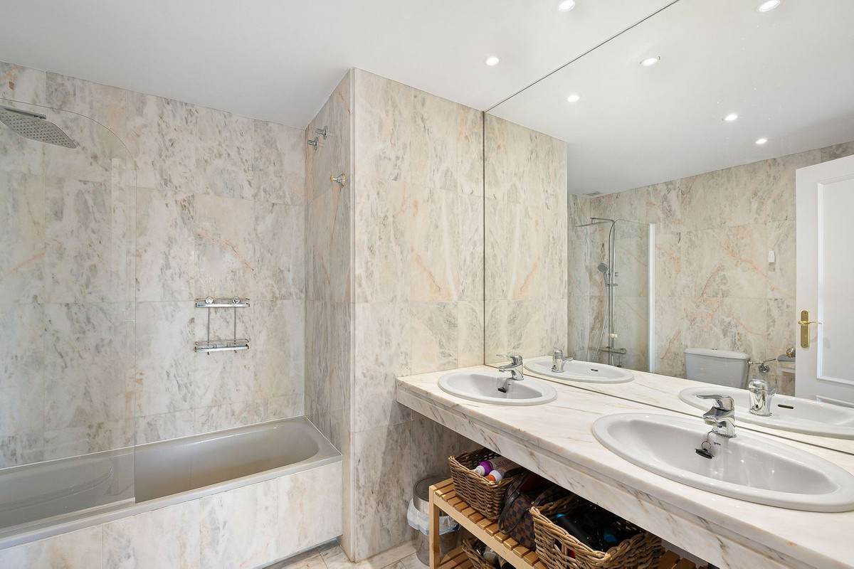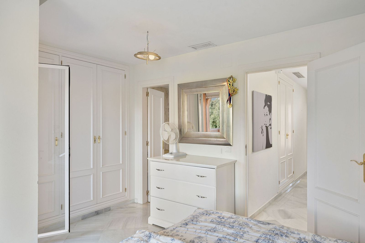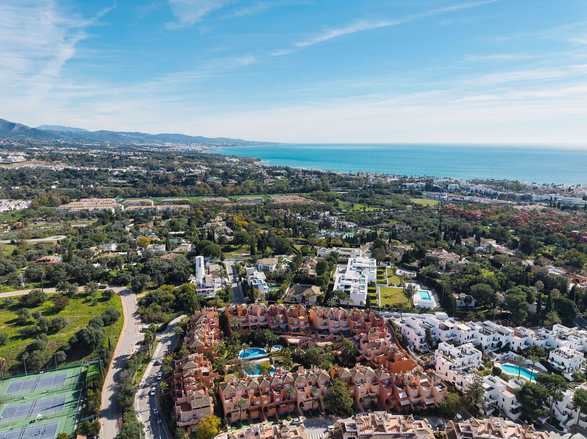 This well presented three-bedroom townhouse spans three spacious levels, combining comfort, space, and a great location in the heart of Nueva Andalucía. A wide selection of restaurants, cafés, bars, and boutiques are within walking distance, while Puerto Banús, sandy beaches, and renowned golf courses are just minutes away. The main floor features a well-sized kitchen with a separate utility room and a split-level dining and living area with an open fireplace. Doors lead to a private terrace with direct access to the communal gardens and swimming pool. All three generous bedrooms have private terraces. The top-floor suite stands out with a large private terrace and an additional terrace with built-in BBQ and open garden views — perfect for outdoor dining and entertaining. Additional features include a private driveway, spacious garage, three en-suite bathrooms, and a guest wc. Located within the sought-after El Palmeral community of just 46 townhouses, residents enjoy two swimming pools, a heated outdoor jacuzzi, sauna, gym, and beautifully maintained gardens in a secure and peaceful setting. A superb opportunity to own a large home in one of Marbella’s most desirable areas.