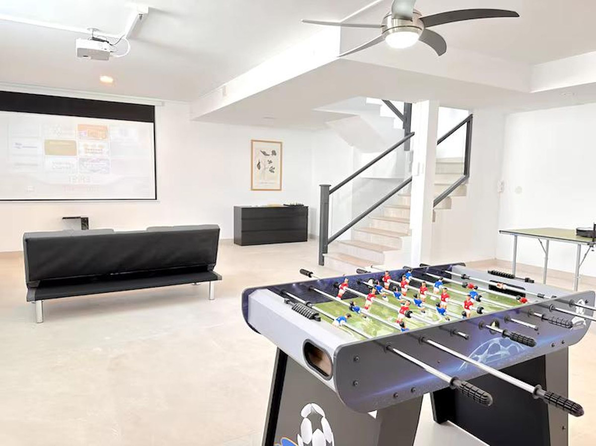 On the lower level, there is a substantial versatile area currently arranged as a cinema and games room, complete with a full shower room. This space was originally designed to be converted into a self-contained two-bedroom apartment with kitchen and bathroom — plumbing and electrical installations are already in place. In addition, a 20 m² area beneath the front terrace was planned as a gym.