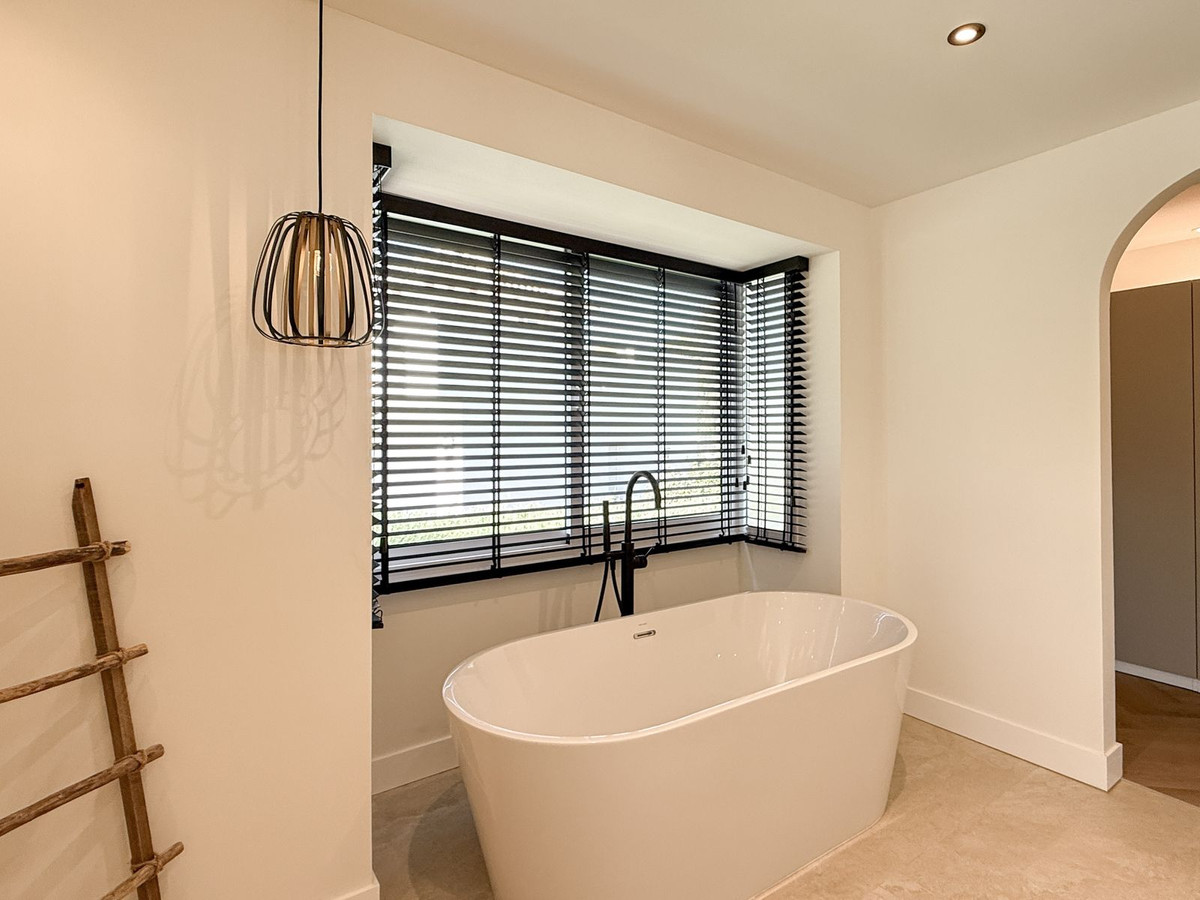 On the ground floor, you’ll find a generous open-plan living area with a fireplace, cinema wall, dining space, and a brand-new kitchen that connects directly to a patio and the garage. From the living room, you overlook the garden and pool, where a shaded area with sun blinds has been created for warm summer days.