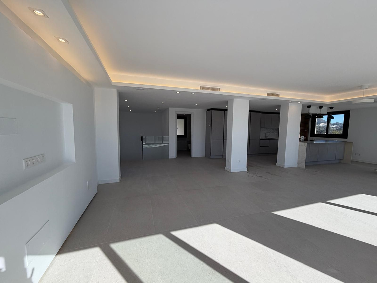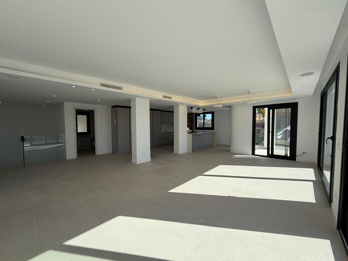 Filled with natural light, the villa boasts open-plan living areas with large windows and glass doors, seamlessly connecting indoor and outdoor spaces and enjoys open views with pleasant sea views. The modern open-plan kitchen features a large central island with an integrated cooking field, ideal for both everyday living and entertaining guests.