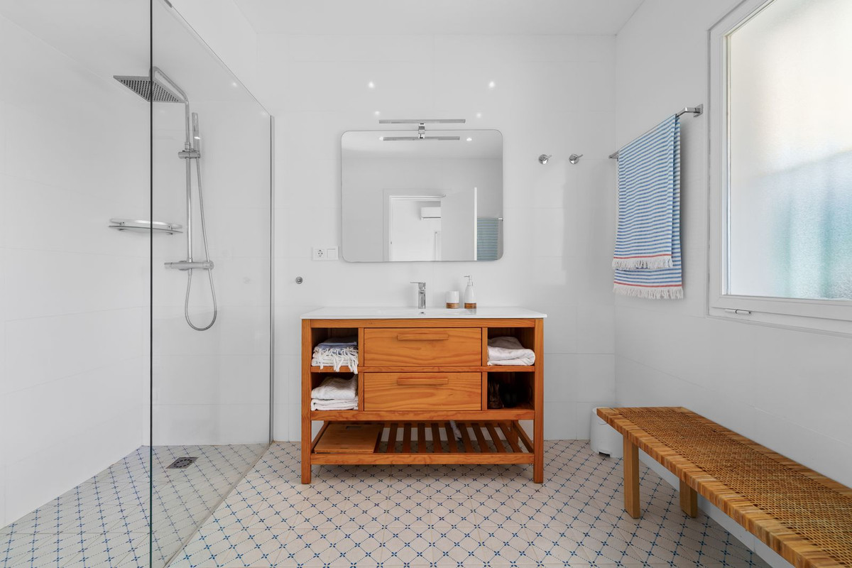 The property offers five spacious bedrooms, three of which feature large sliding doors that open onto the lush garden, seamlessly blending indoor and outdoor living. All bathrooms have been tastefully renovated and are equipped with showers, providing a modern and exclusive feel.